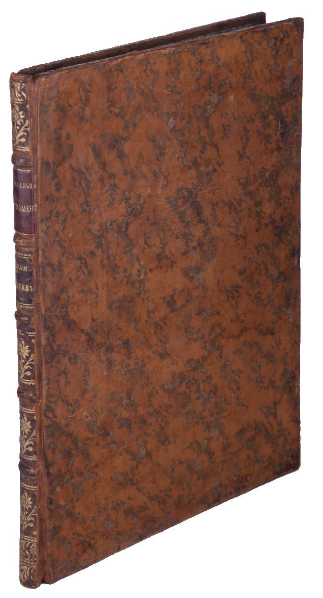 Издание вышло без титульного листа. Гравированный инициал «П» с орлом и весами на первой странице. В коричневом цельнокожаном переплете. Поребрики украшены тиснением золотом. Кожаная наклейка на корешке и форзацы поновлены. Бледные разводы по страницам, реставрация фрагмента нижнего поля с. 25–32 (бумага). Сохранность хорошая.