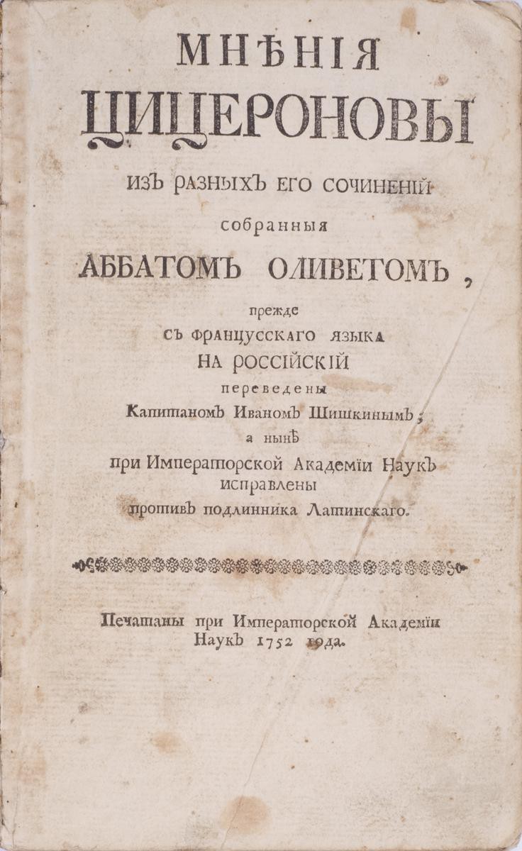 Первое издание на русском языке рассуждений Цицерона о законе, человеке, совести, страстях, премудрости, честности, красноречии. Перевод был исправлен и отредактирован М.В. Ломоносовым.