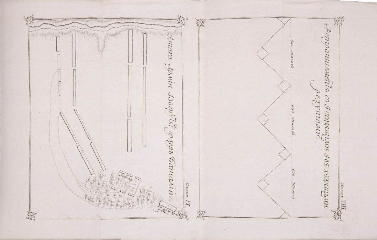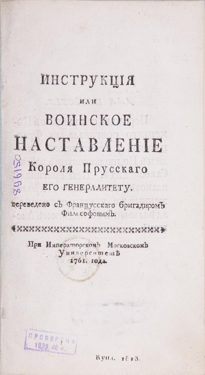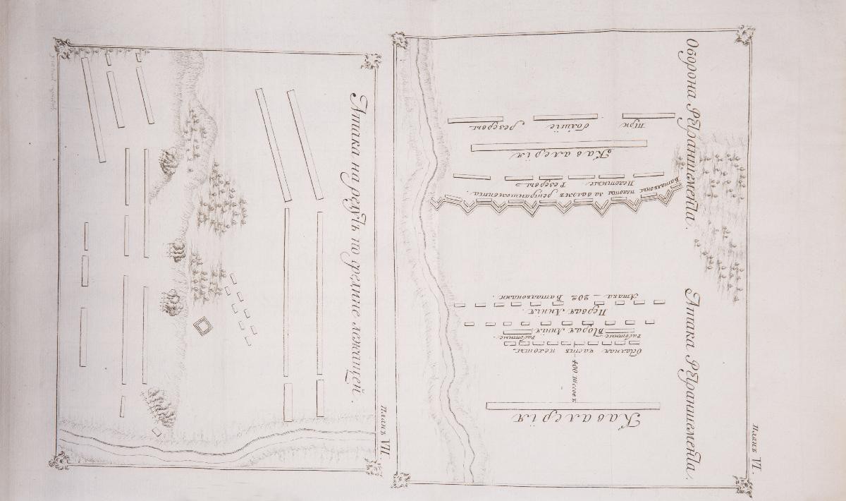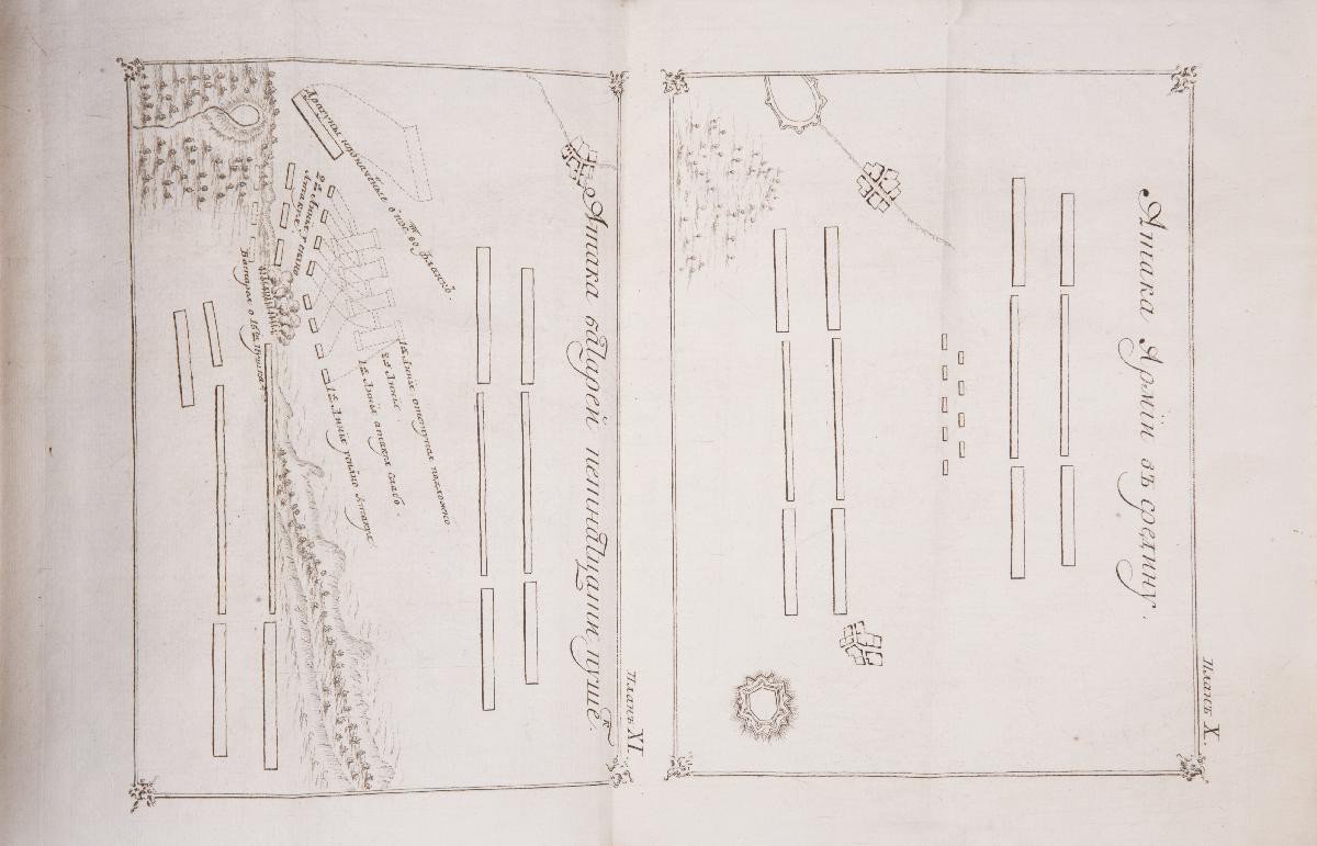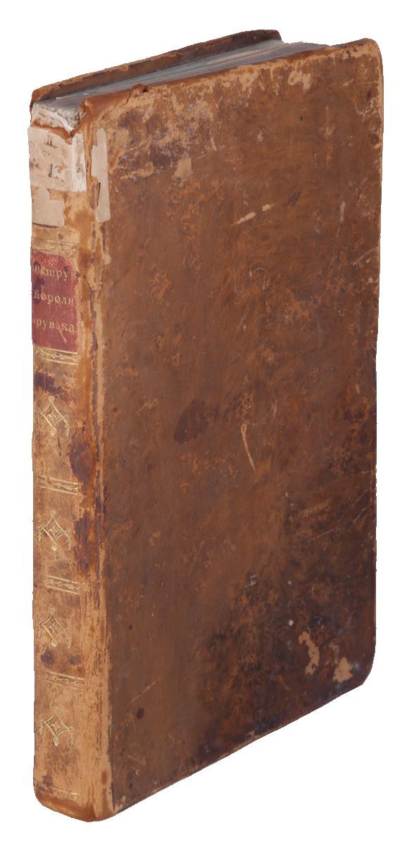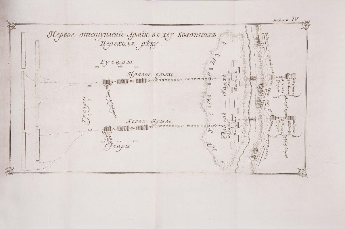 Тринадцать раскладных гравированных планов маршрутов, отступлений и атак армии на восьми отдельных вклейках в конце книги. На седьмом плане подпись: «Г. Степан Карнович». В коричневом цельнокожаном переплете эпохи. На корешке красная кожаная наклейка с вытисненным золотом названием книги. Форзацы из «мраморной» бумаги. Потертости переплета, утрата небольшого фрагмента верхней части корешка, потертости на тит. л., штамп «Проверено 1939–40 г.» на тит. л., следы от владельческих наклеек на форзаце, утрата фрагмента с. 139–140, планы подклеены. Сохранность хорошая.