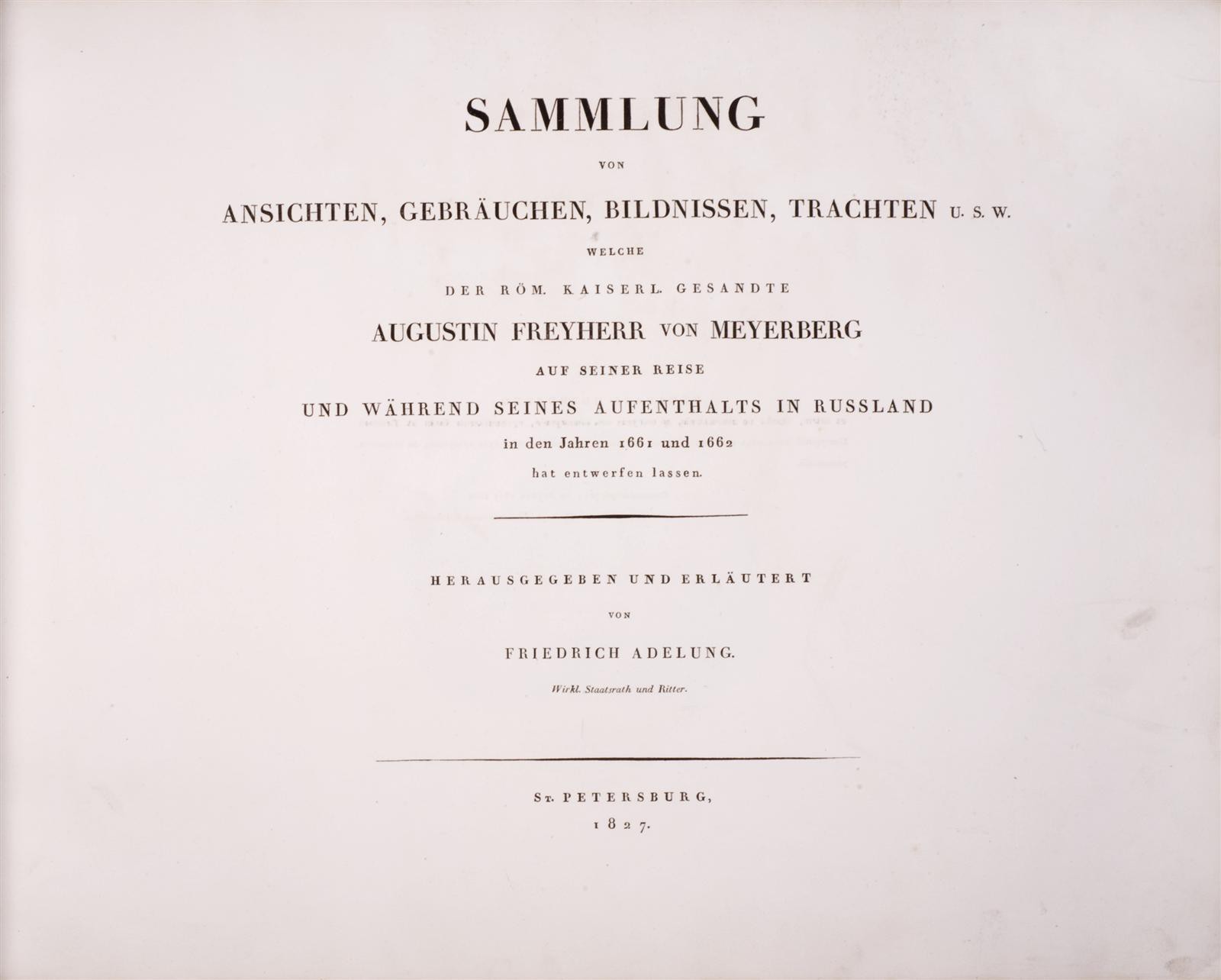 Августин Мейерберг (1612-1688) - австрийский дипломат, в 1661-1662 годы находился в России в составе посольства от австрийского императора Леопольда I, прибывшего для посредничества между Россией и Польшей, воевавшими из-за Украины. Итогом пребывания дипломата в России явилось богато иллюстрированное «Путешествие в Московию». Рисунки, собранные бароном Мейербергом в годы его путешествия по России, хранились в Дрезденской библиотеке. Действительный статский советник Федор Аделунг в 1827 году решил их издать. Сначала рисунки копировались художником в Дрездене, а затем с копий воспроизводились литографом в Петербурге. Полный комплект – редкость. Ульянинский, № 4039; Н.Б. № 350; Обольянинов. № 2325. Соловьев, Кат. № 100: Редкие книги. № 1 («редкое издание» - 25 руб.).