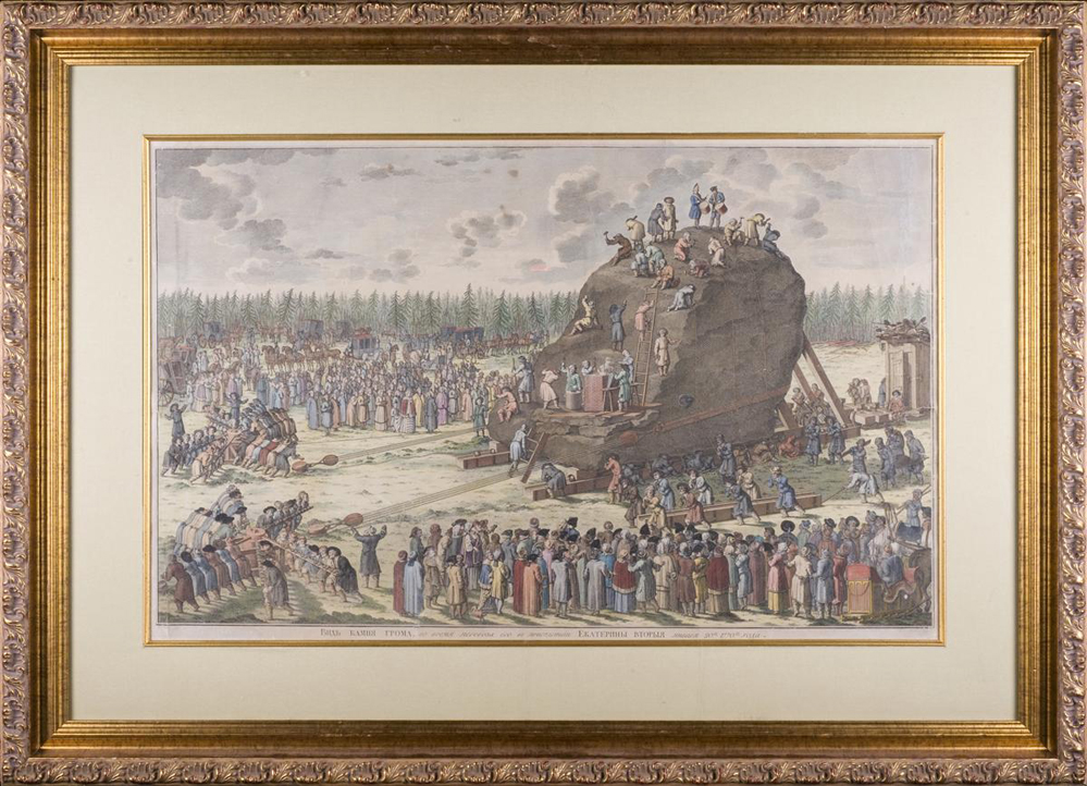 Шлей И.Ф ( J.VSchley) (1715-1779), c рисунка Фельтена Ю.М. ( G.Velten ) ( 1730-1801). 1770 год. Бумага верже, гравюра резцом, акварельная раскраска. Гравюра оформлена в паспарту и раму со стеклом. 44х71см. Крайне редка, в раскрашенном виде не находима.