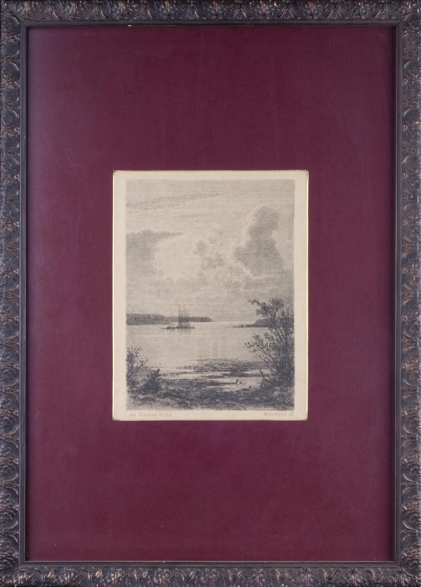 1886 г. офорт, шелк, рама — дерево, паспарту оригинальное. Слева внизу выгравировано название «На малой Неве», справа - «Шишкинъ 86». 20х14,5 см.