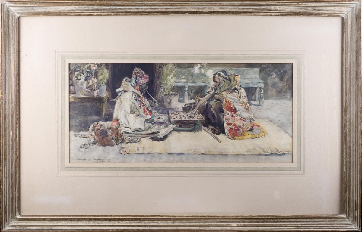 Акварель, бумага, оформлена в паспарту и раму. Подпись внизу слева: «Adamson Paris, 1915». 23х51,5 см.