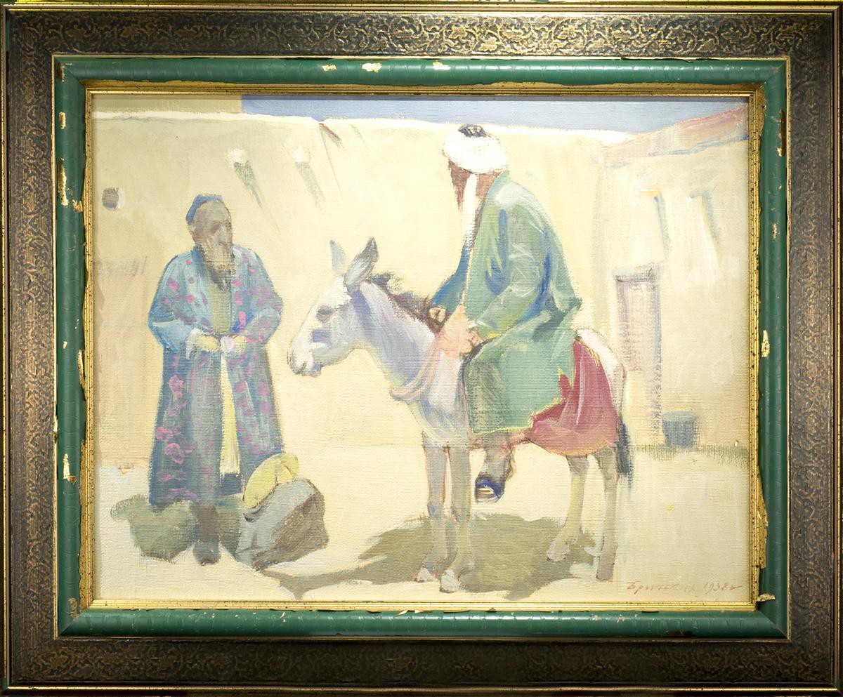 1938 год. Холст, масло. Справа внизу подпись «Брынских 1938». 50х65 см. Брынских Борис Александрович (1924-1998) — заслуженный художник УзССР, живописец, график, профессор. Закончил республиканское художественное училище (Ташкент, 1948 г). Борис Брынских хорошо знал народную жизнь, ее своеобразные черты, верно подмечал характерные детали, придающие им национальную специфику. Глинобитные дома, дувалы, величественные чинары, серебристо-зеленые тополя. Картины воспринимаются как яркие, живые сценки их жизни народа. Излюбленные мотивы Брынских — старый город Ташкента, его улочки, окрестные сады, мечети. Большая коллекция картин находится в музее искусств Узбекистана (Ташкент), в коллекции Национального банка Узбекистана (Ташкент). Его произведения заслуженно вошли в золотой фонд современной живописи Узбекистана.