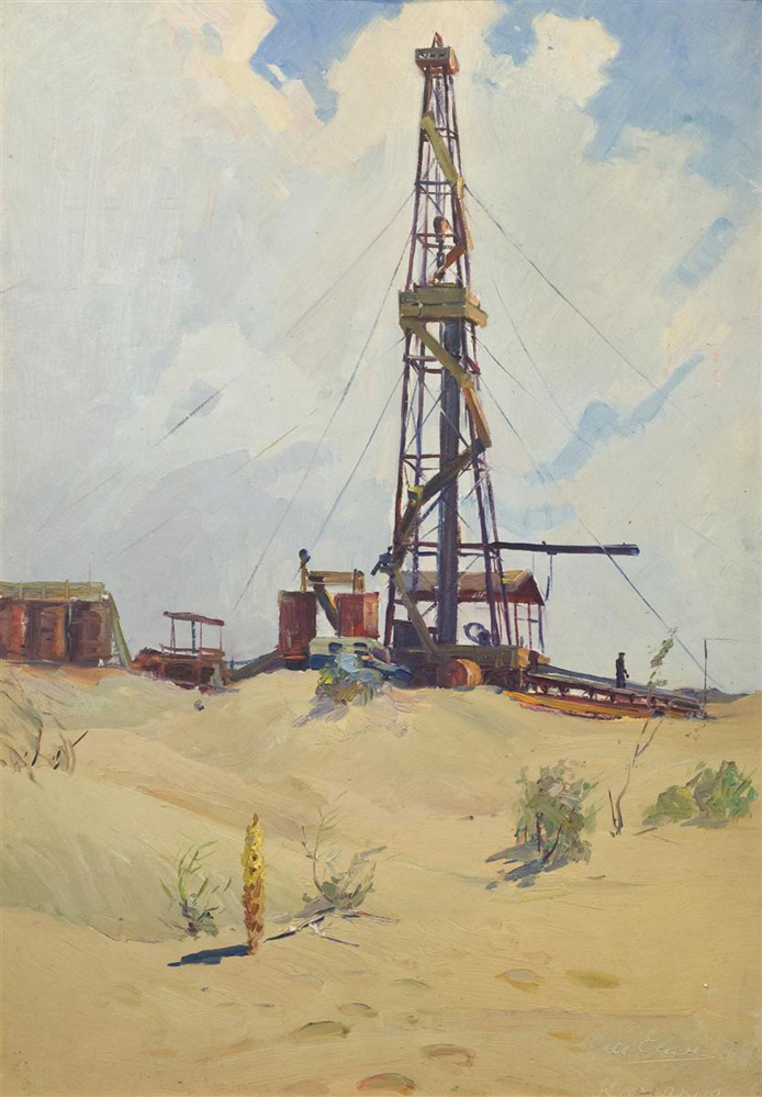 1966 год. Картон, масло. Справа внизу подпись художника «М. Есин. Кандым». 50х70 см. Михаил Митрофанович Есин (род. 1922 г.) - живописец, Член Союза художников СССР. Жил в Ташкенте. Родился на Алтае. Учился в РХУ имени П.П. Бенькова в Ташкенте (1945-1949). В своем творчестве обращался к теме созидательной деятельности человека, покоряющего просторы необжитых степей. Произведения хранятся в Государственном музее искусств Каракалпакии, Нукус.