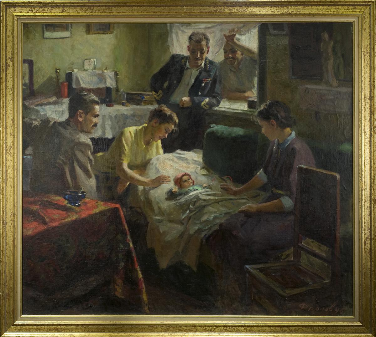 1946 год. Холст, масло. 85х95 см. Справа внизу имеется подпись: «Фролов. 46». Фролов Серафим Леонидович (1924 – 1970). В 1951 г. окончил МГХИ им. В.И. Сурикова. Жил и работал в Москве. Принимал участие во «Всемирной художественной выставке» в 1951 и в 1955 гг. Работал в области портрета, жанра и пейзажа. Картины художника отличаются классической завершенностью, живой пластической манерой и склонностью к почти литературной повествовательности в построении живописной композиции. Основное вдохновение художник черпал в созидательной атмосфере эпохи и в портретах новых людей страны победившего социализма. Не чужд был художник и интимно-камерного жанра в изображении быта советских людей. Одной из характерных картин, иллюстрирующих именно этот подход, является многофигурное живописное полотно под названием «Семья», где автор очень тонко передал светлые и радостные чувства молодых родителей и их близких, а также саму атмосферу тихого послевоенного быта. Эти настроения были характерны в целом для всего искусства того времени, выполнявшего некий социальный заказ на утверждение новых смыслов и вдохновенное обновление всех сфер человеческой жизни.