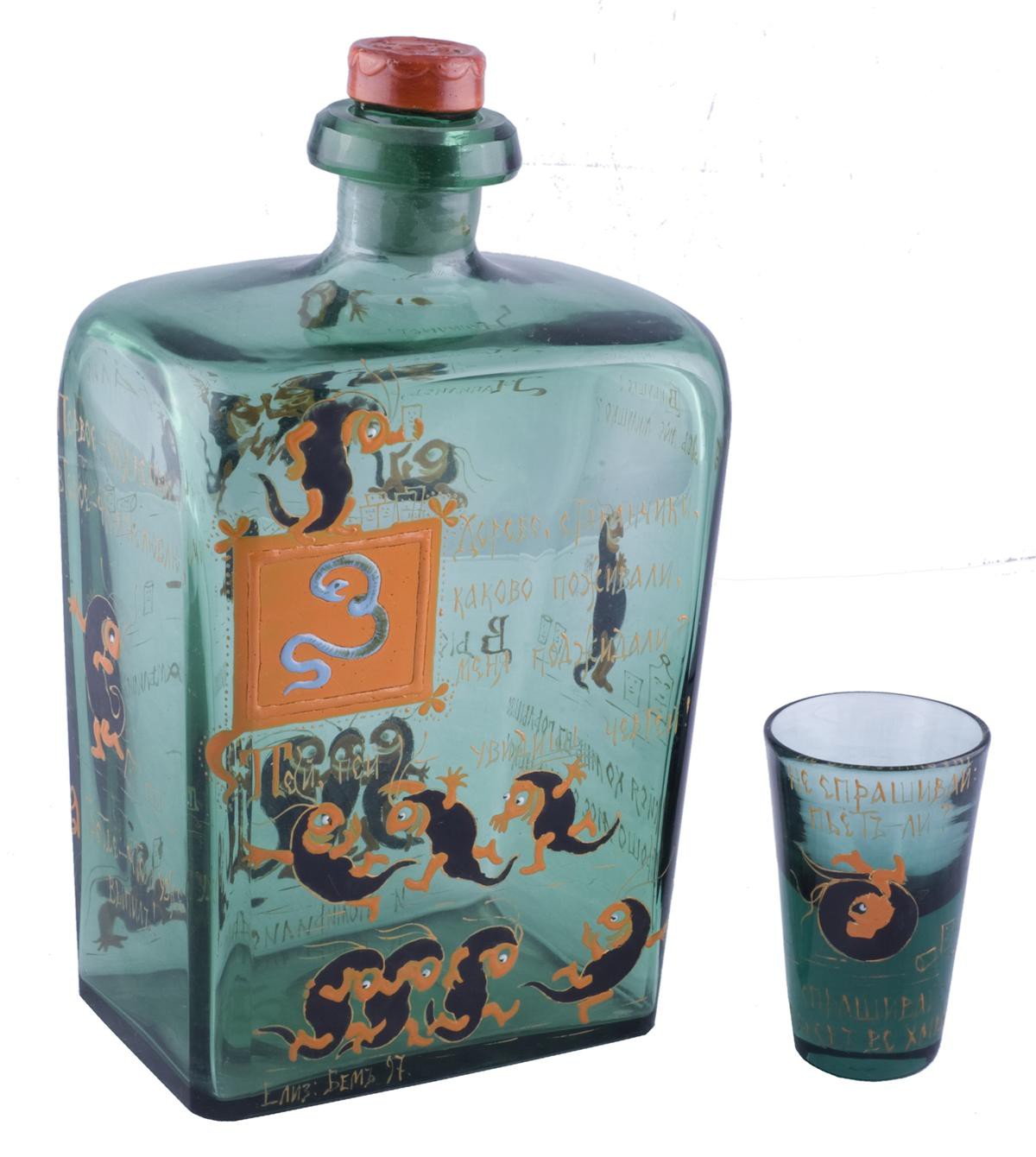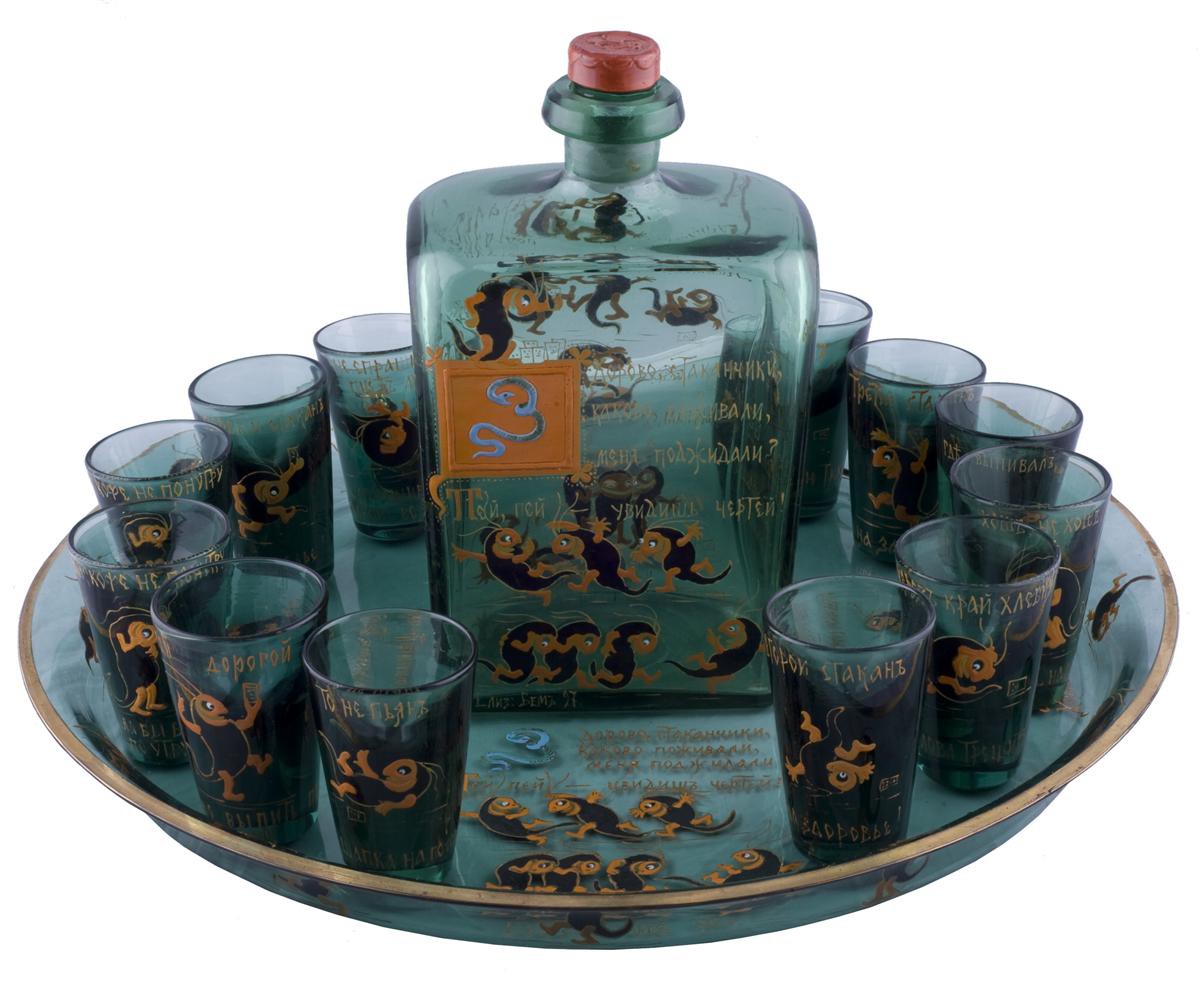 Россия, нач. XX в. Дятьковский хрустальный завод, художница - Елизавета Бем. Зеленое стекло, эмаль. Размеры: высота штофа -23см; высота рюмки - 8см, диаметр подноса - 40,5см. С именем Елизаветы Бем связана одна из самых ярких страниц в развитии русского национального стиля в стекле. Она делала формы для посуды, ориентируясь на старинные предметы: братины, стопы, чарки, ковши. Придумывала рисунки для эмалей. Сама расписывала посуду и внимательно наблюдала, если росписи делал кто-то другой. Работы Елизаветы Меркурьевны участвовали в международных выставках — в Париже (1900), Мюнхене (1902), Милане (1906) — и везде получали медали. В Милане художница получила золотую медаль, как и на выставке в Чикаго (1893), за «прекрасную общую композицию, общий типичный характер орнаментальных деталей, высокую художественность возрождения древнего византийского и национального стиля». Наиболее популярной авторской работой Е. Бём, вошедшей в прейскурант Дятьковского завода, стал набор для вина, отмеченный народным юмором. Художница сознательно выбрала зеленый цвет стекла, форму штофа и технику эмалевой росписи, свойственные русскому стеклу ХVIII в.Фирменным знаком творений Бём, будь то акварели или изделия из стекла, были подписи. Художница использовала незатейливые коротенькие стихи. Стаканчики в наборе являются обманками. На 2/3 они заполнены стеклянной массой и вмещают не так уж много жидкости. На каждом – шутливая надпись-тост, предостерегающая от чрезмерного увлечения «зеленым змием», и порядковый номер в процессе употребления напитка. И если чертики на первых стаканчиках призывают выпить «на здоровье», «на веселье», «на задор», то на следующих читаем: «чай, кофе не по нутру, была бы водка по утру», «где выпивал, там и ночевал», «на радости выпил, с горя – запил», «хошь – не хошь, а выпить надо!». Комплект крайне редок.
