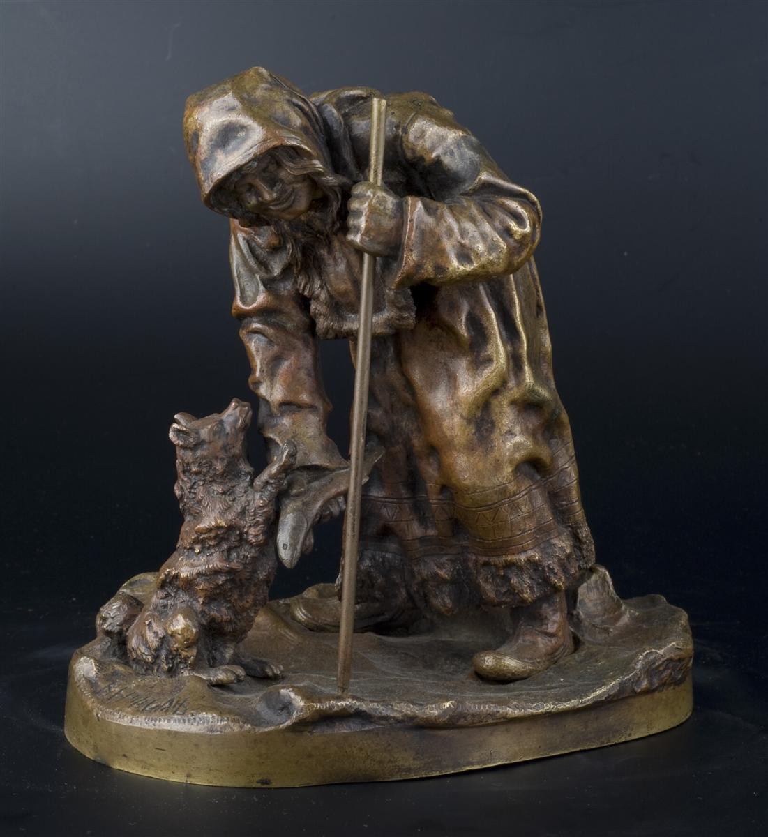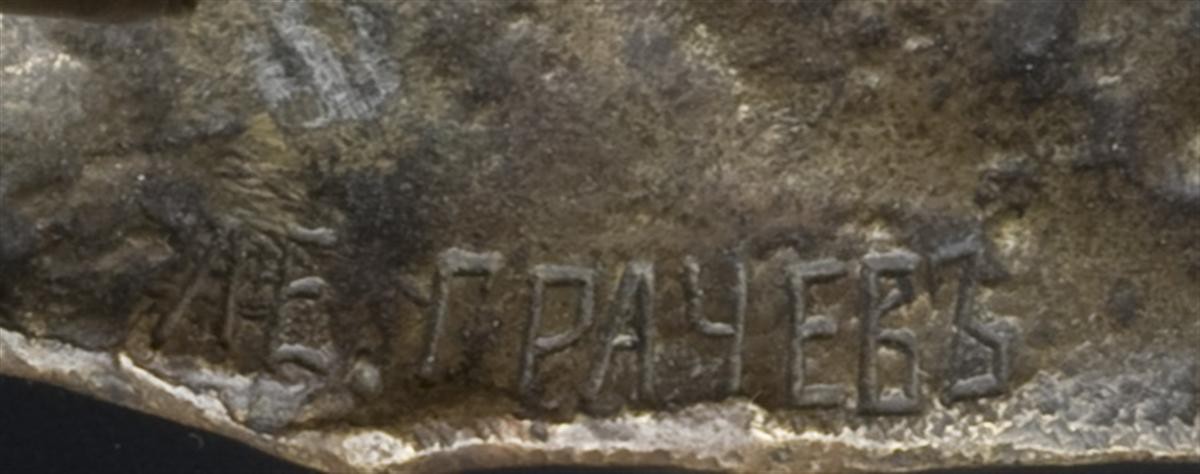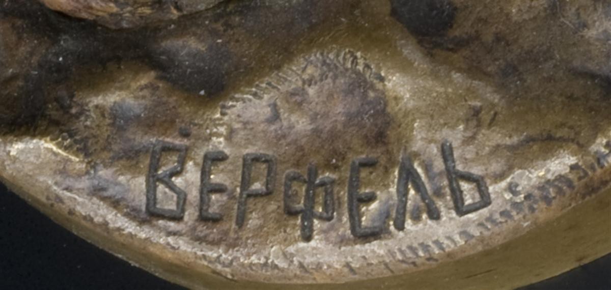 Россия, Санкт-Петербург, скульптор Л.Е.Грачев, отливка завода художественной бронзы К.Ф. Верфеля, кон. XIX в. Бронза, литье, чеканка, патинирование. Клейма: скульптора"Л.Е.ГРАЧЕВЪ"и завода "ВЕРФЕЛЬ". Размеры: 15х10х15см.
