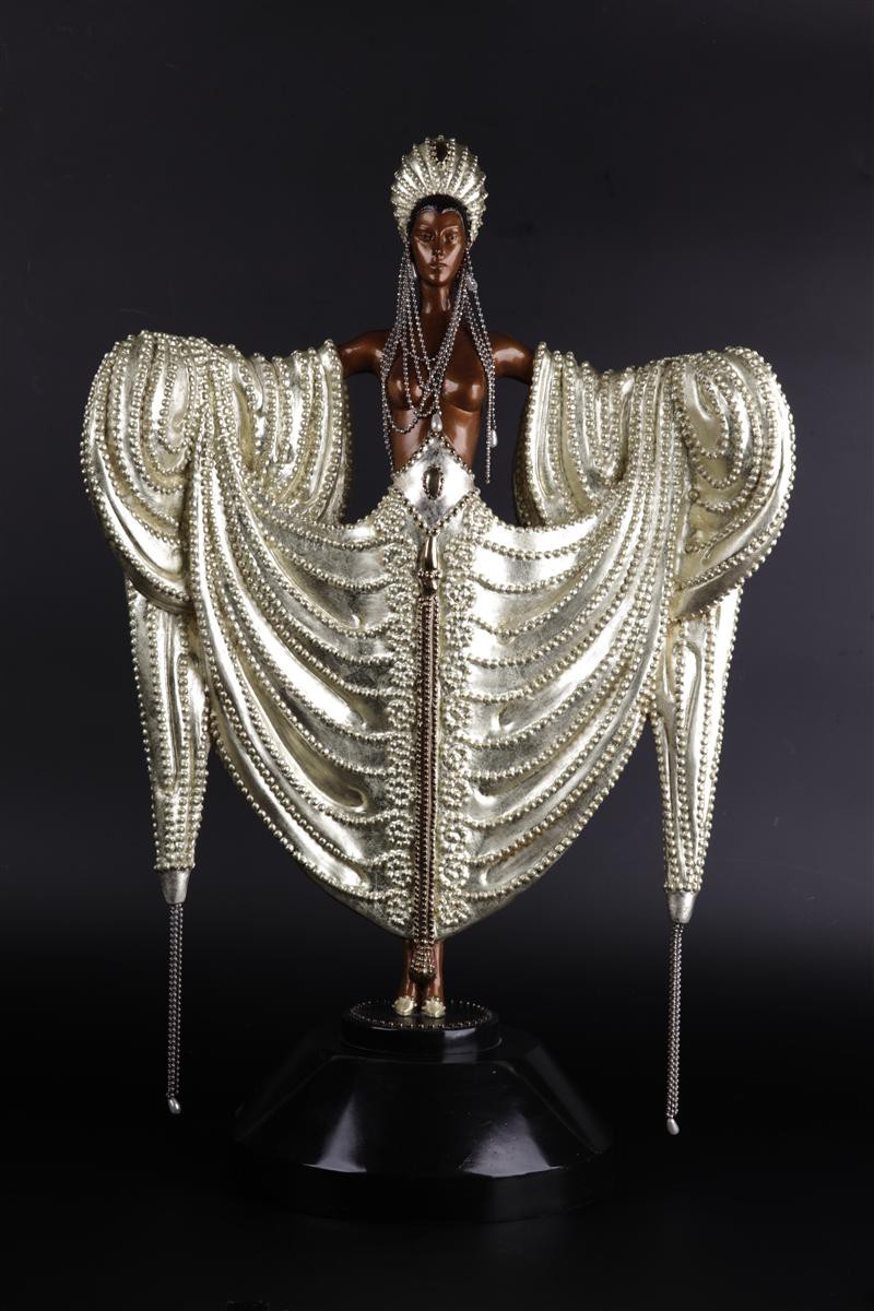 Лондон, скульптор Эрте, 80-е годы XX века.Бронза, литье, чеканка, золочение, роспись эмалевыми красками, постамент-мрамор.Напостаментенадпись:"1988 CHALK & VERMILION AND SEVENARTS 221/375".Высота 57см. Эрте – художник моды, график, автор театральных костюмов и скульптор один из самых ярчайших представителей стиля Арт-Деко. Эрте - это псевдоним. Настоящее имя одного из самых успешных художников XX века- Роман Петрович Тыртов. В 1960-е годы Эрте обратился к еще одному новому для себя виду искусства - скульптуре. Персонажи ранних рисунков и гуашей словно обрели плоть и кровь, переместившись в трехмерное пространство, бронзовая поверхность подвергалась тщательной обработке, покрывалась цветной патиной, позолотой и серебром, что диктовало другие, более насыщенные, чем в графике, цвета. На подготовительных стадиях Эрте мог изменить композицию в сторону большей динамичности или, наоборот, статичности. Он добавлял или убирал отдельные детали. В результате художник создал более сотни скульптур; для всех он разрабатывал оригинальные постаменты, превращая каждую работу в полномасштабную театральную постановку.
