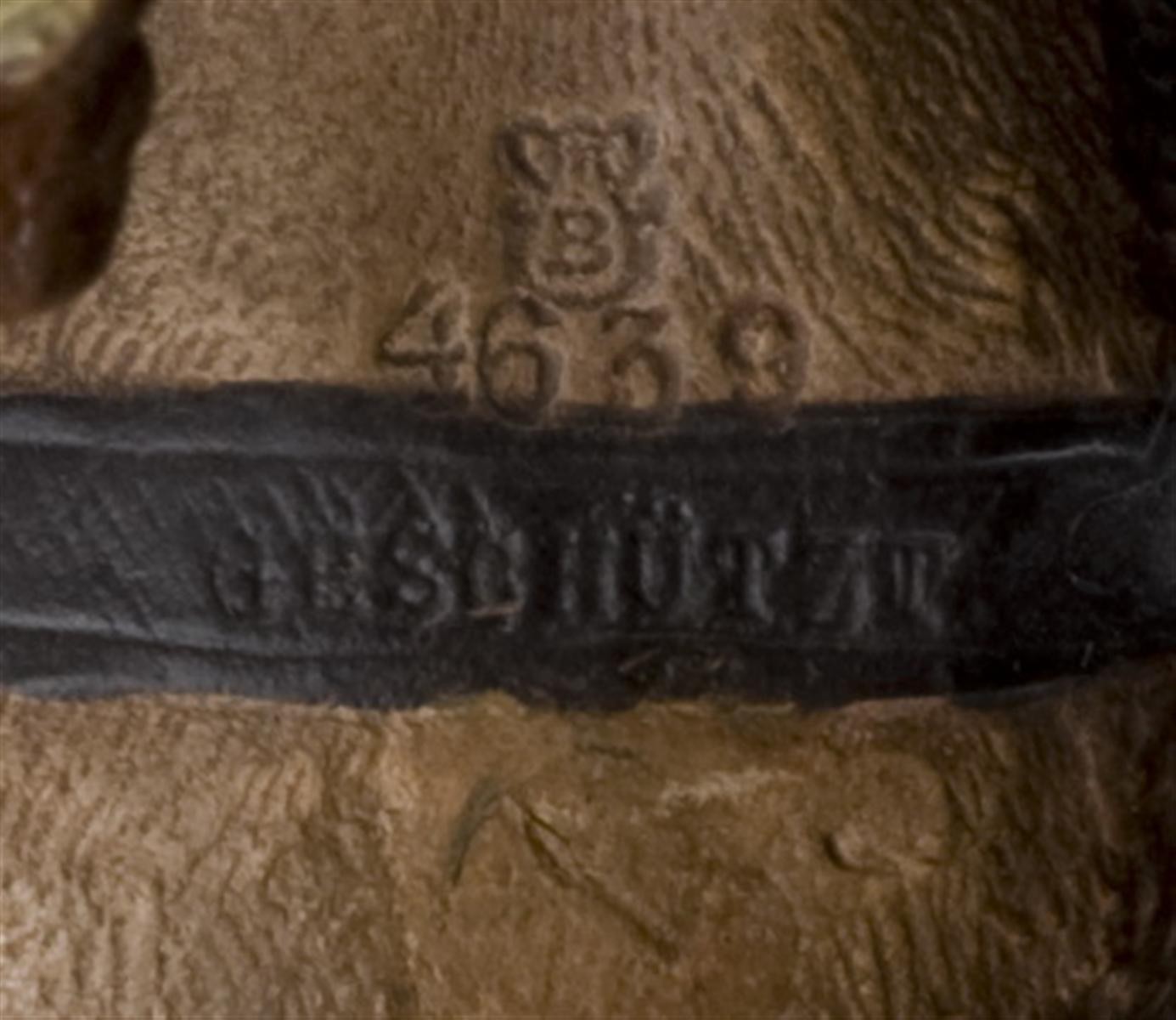 Австрия, Вена, фабрика Бергмана (Franz Xavier Bergman), кон.XIX нач.XX вв. Бронза, литье, чеканка, роспись красками, монтировка. Клейма: литера "В" в кувшине, "GESCHUTZT"(" авторское право"или "зарегистрировано"), номер "4639". Высота - 20,5см., длина - 16.5см., ширина - 12,5см.