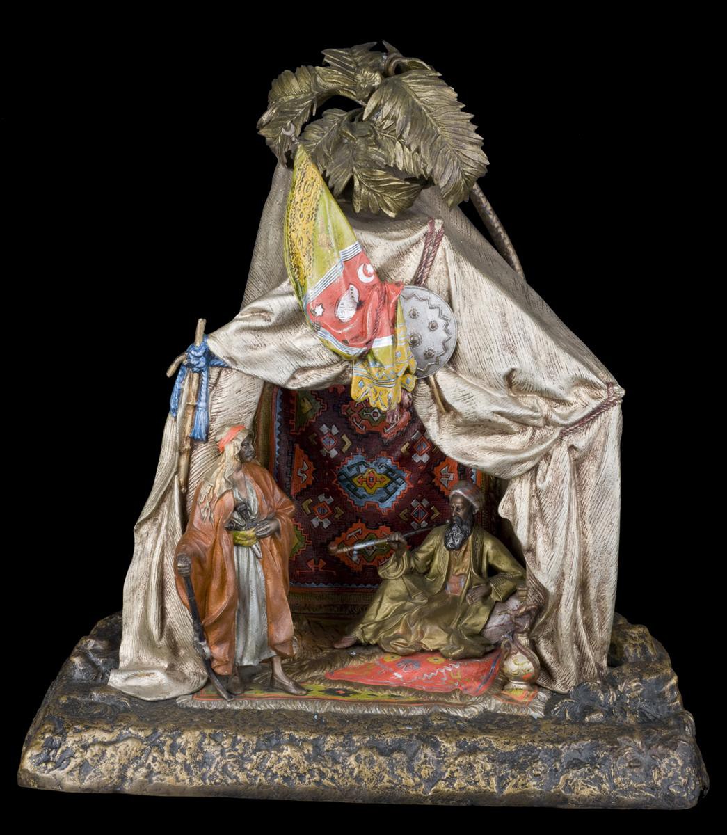 Австрия, Вена, скульптор A.Chotka , кон.XIX нач.XX вв. Бронза, литье, чеканка, роспись красками , монтировка. Клеймо: вдоль заднего края позема "CHOTKA"и "AUSTRIA". Высота - 35см., длина - 33,5см., ширина - 19см.