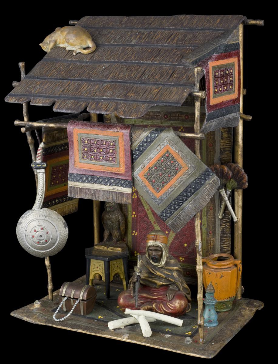 Австрия, Вена, кон.XIX - нач.XXв. Шпиатр, литье, чеканка, роспись красками, монтировка. Клейма: на левой опоре шатра "AUSTRIA".Размеры: 29х21,3х14,5 см.