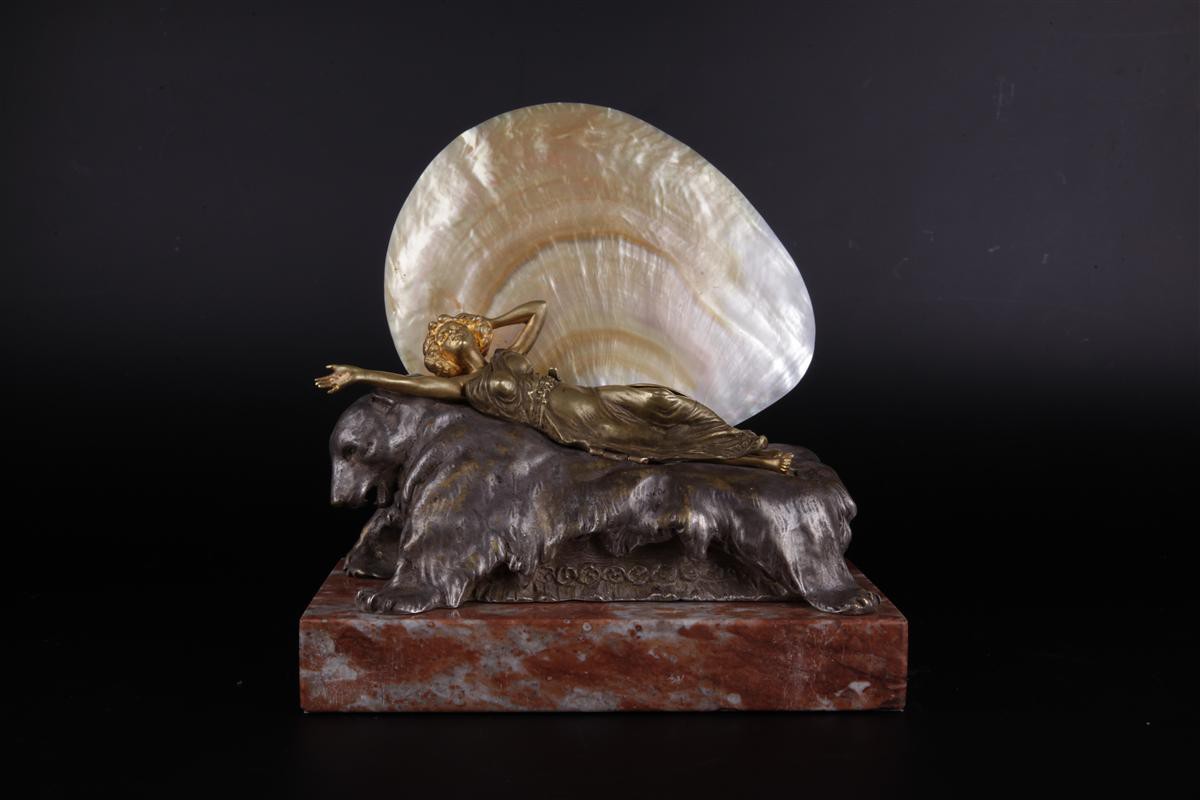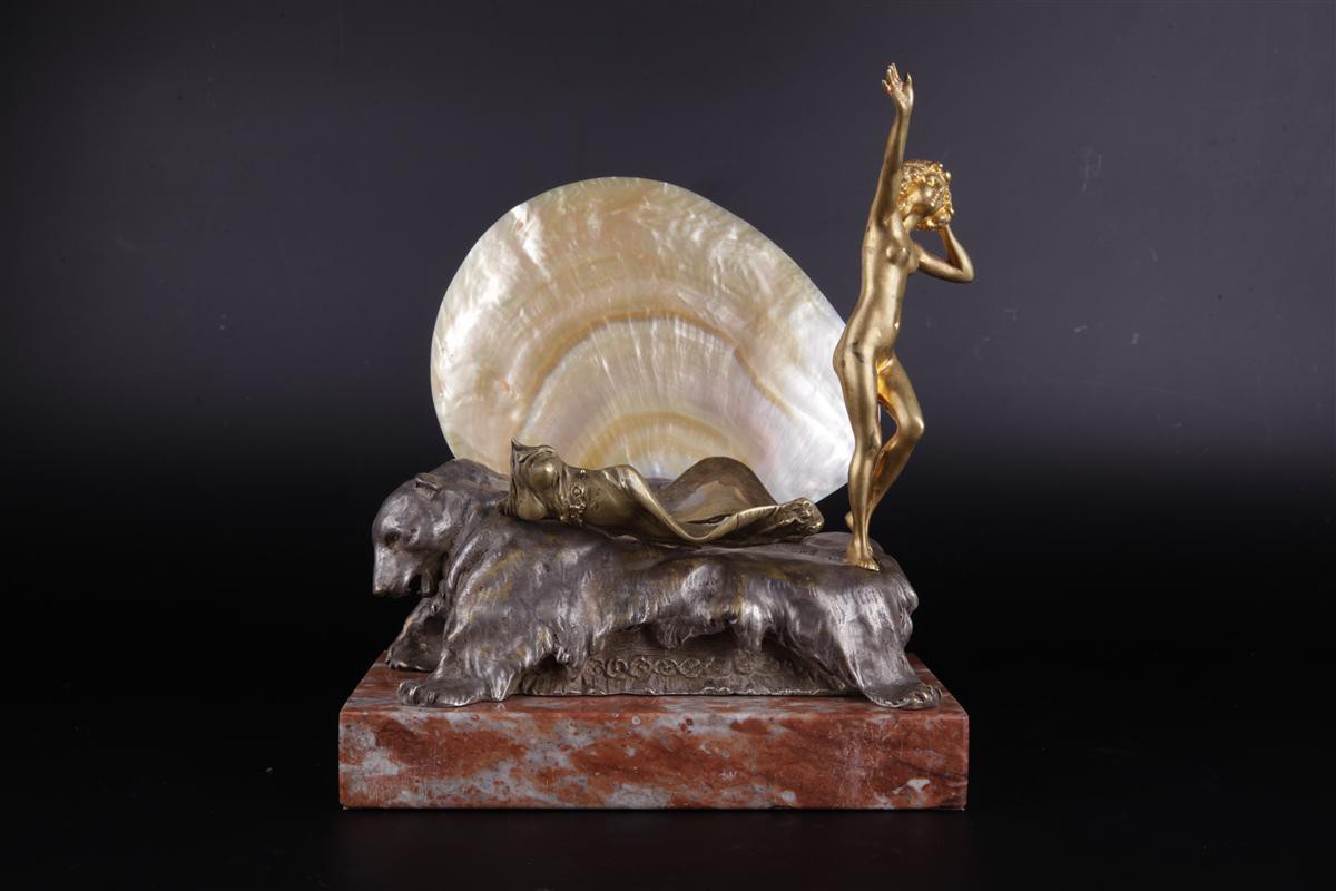 Западная Европа, нач. XX в. Венская бронза, золочение, патинирование, перламутр, подставка - мрамор. Подпись : " С Kauba". Размеры: высота-26см, длина-22.5,ширина-12см.