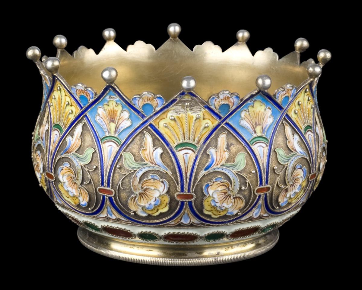 Россия, кон. XIX в. Серебро, литье, многоцветные эмали по скани, канфарение, золочение.Клейма: 84 пробы, клеймо мастера неразборчиво. Высота - 6 см, диаметр - 9,5см.
