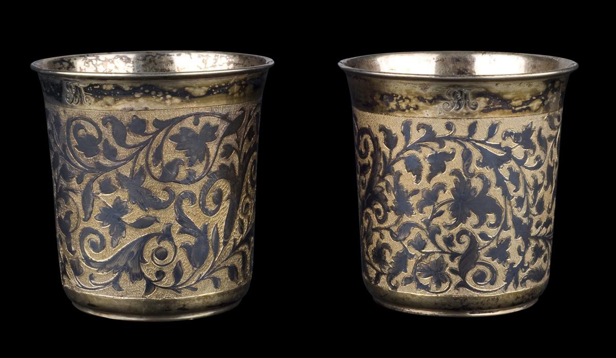 Россия, Москва, 1-я пол. XIX в. Серебро, литье, чернь, канфарение, золочение. Клейма: цифра "84", городской герб Москвы -" Георгий Победоносец", пробирного мастера "А.К" (Ковальский Андрей Антонович, работал 1821-1856гг.) над годом "1848", инициалы мастера "А.К.". Высота - 7 см., диаметр - 7 см.