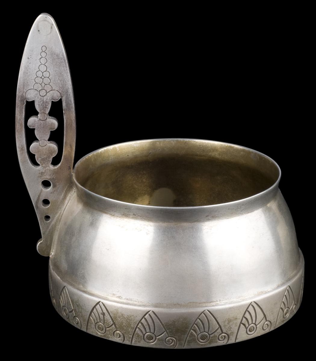 Россия, Москва, кон. XIX в.Серебро, литье, гравировка, просечка, золочение. Клейма: пробы серебра 84 "И.Л"(инициалы управляющего округом Ивана Лебедкина) в овальном щитке, мастера "М.С"(Соколов М.Ф.- серебряного и черневого дела мастер, имел мастерскую в 1860-1890-х гг.). Размеры: высота -5см, диаметр основания - 8,8см, верхний диаметр - 7,7см.