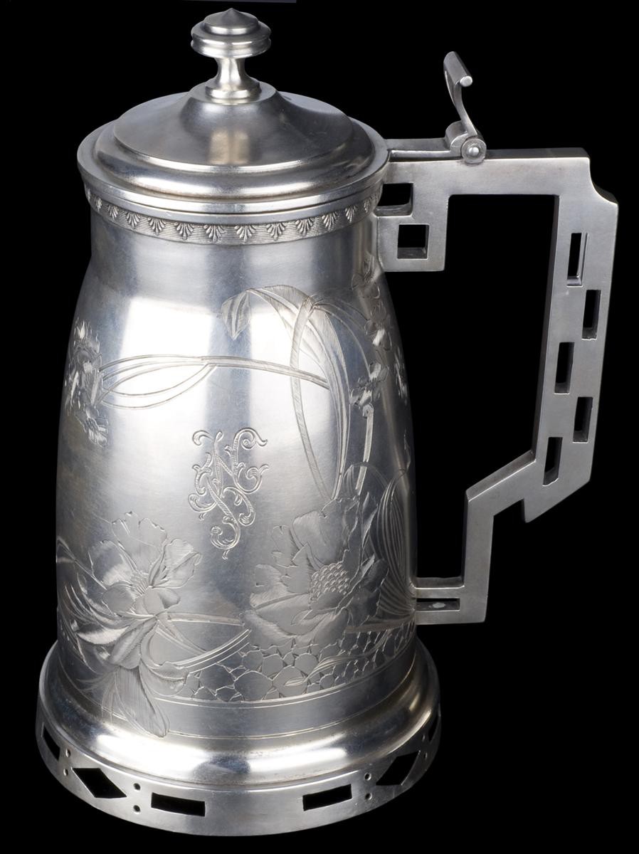 Россия, СПБ,5-я артель, кон.XIXв. Серебро, позолота, гравировка- цветочный орнамент, монтировка. Клейма: пробирное "84" с женской головкой в кокошнике ,повернутой вправо; в овальном щитке артели «5А» Высота:20 см.