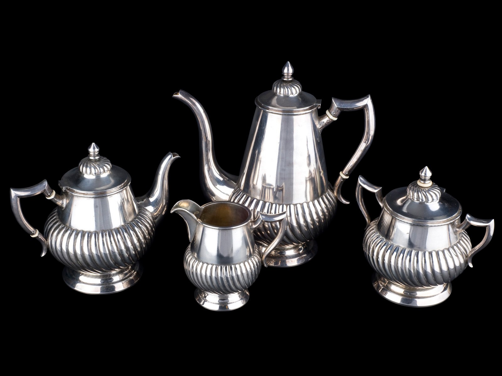 Россия, Москва, кон.XIXв. Серебро, литье, чеканка, золочение (внутренней поверхности), кость , монтировка. Клейма: пробы серебра "84", пробирного мастера с инициалами "Л.О"( Олекс Лев Федорович - пробирный мастер в 1890-1896гг.) над годом "1896", герб Москвы "Георгий Победоносец", инициалы мастера "Г.С" ( Сбитнев Григорий Михайлович, имел собственную мастерскую). Высота кофейника - 22см., высота чайника - 15см., высота сливочника -10,5см., высота сахарницы - 14,5см.