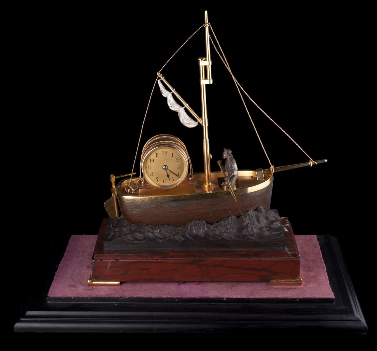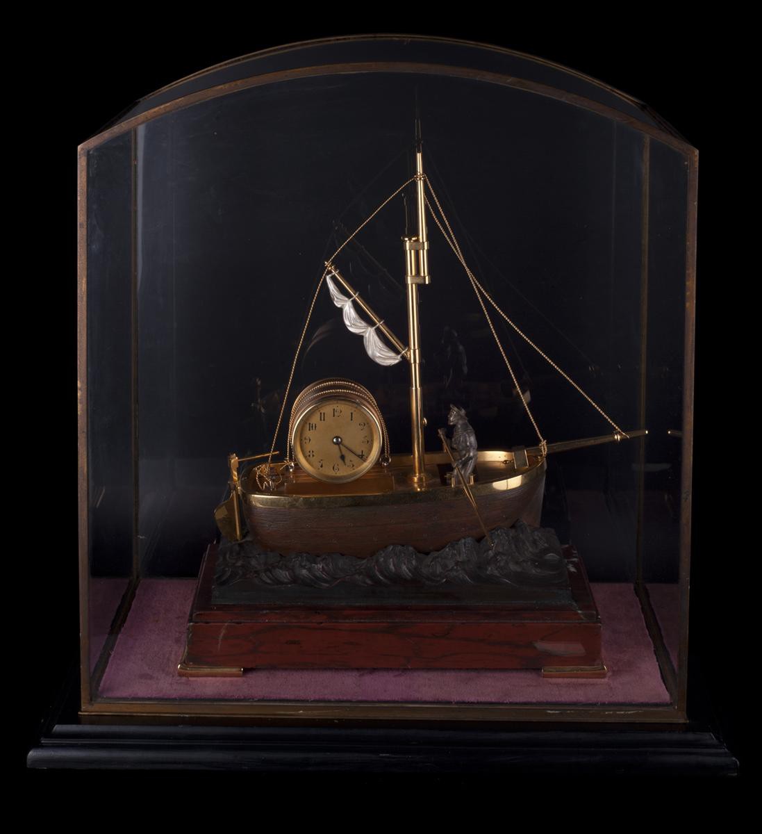 Европа, Конец 19 –нач. 20 века. Латунь, бронза, золочение, серебрение, патинирование, стекло, монтировка, подставка - дерево, бархат. Высота - 42см., колпака - 25,5см. При заводе часового механизма фигурка матроса начинает грести.