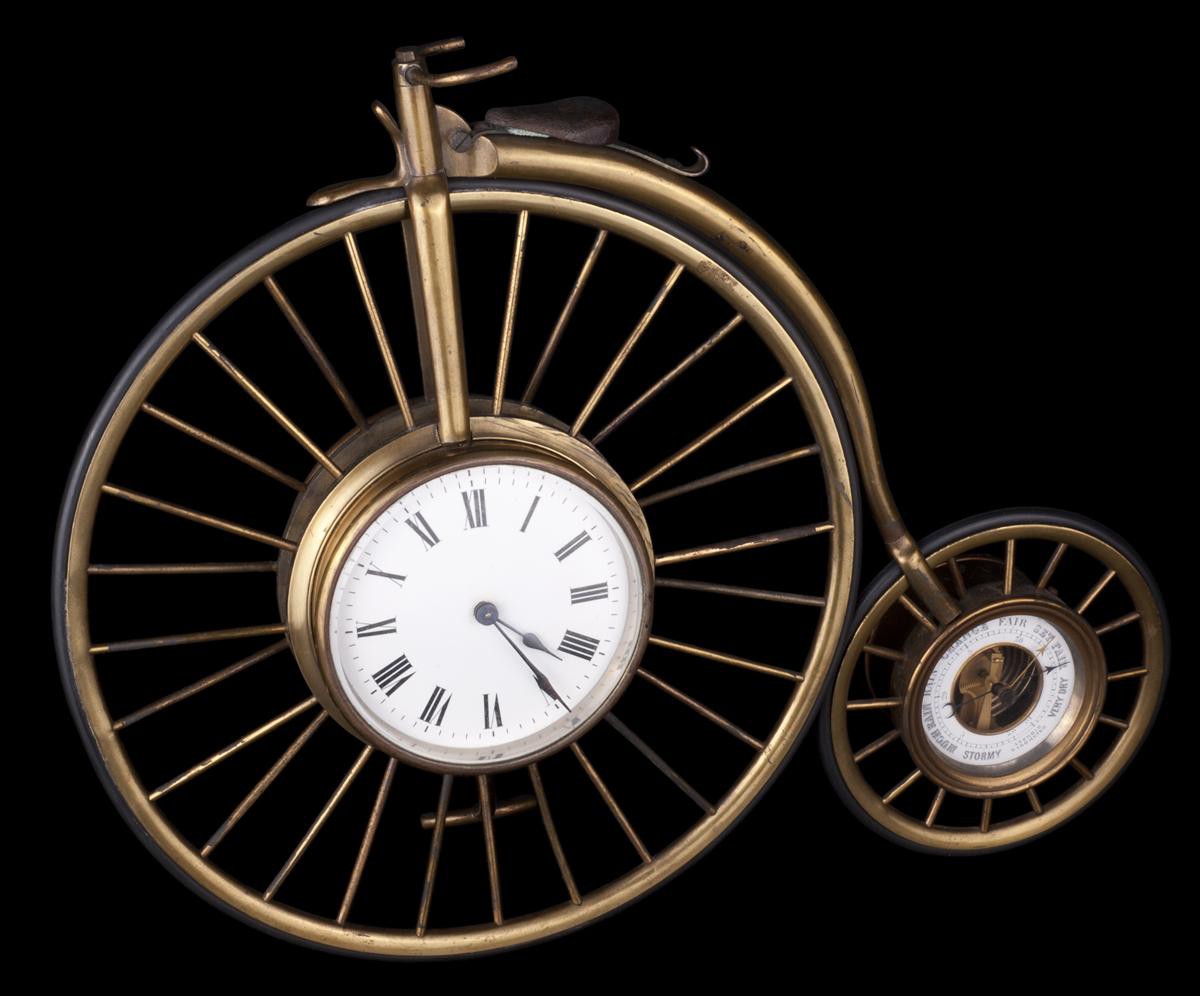 Европа, Кон.XIX-нач. XX в. Латунь, стекло, кожа, монтировка. Высота -26,5см., длина - 35см. В колеса старинного велосипеда вмонтированы корпуса часов и барометра-анероида.