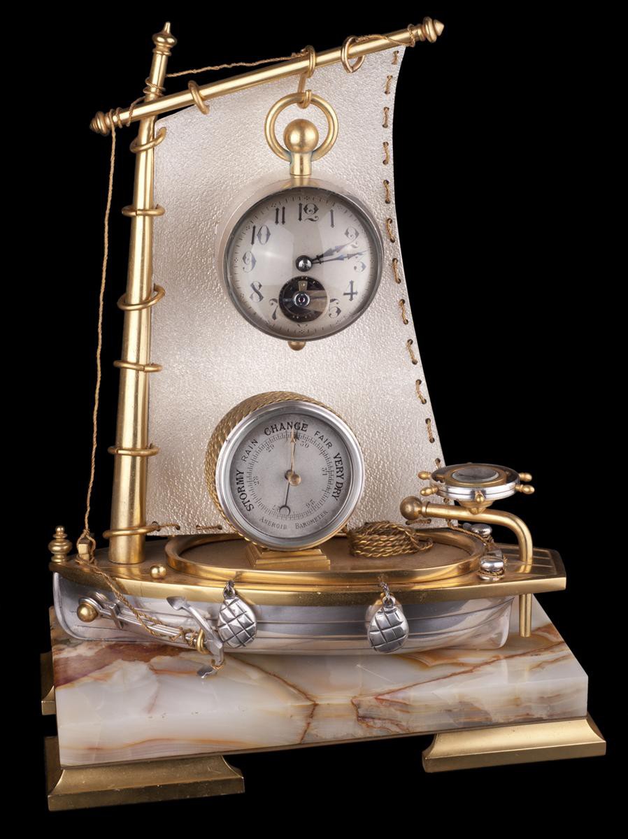 Франция, Конец 19 – нач. 20 века. Латунь, металл, серебрение, золочение, стекло, подставка-камень, монтировка. Размеры:33х25,5х13см.На паруснике вмонтированы корпуса часов, барометра-анероида и компаса.