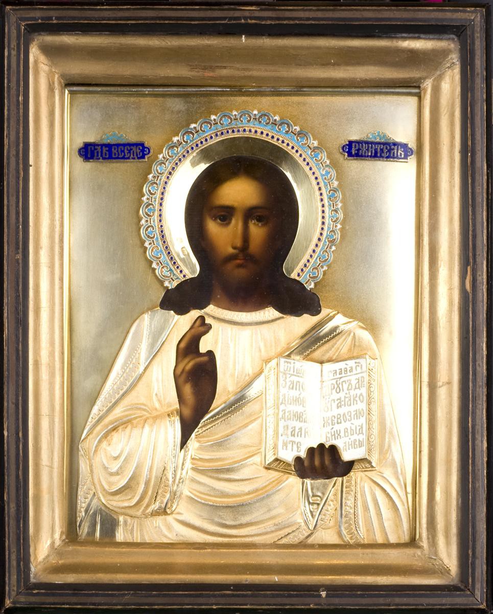 Россия, Москва, кон. XIX в. Серебро, чеканка, золочение, выемчатая эмаль, дерево, масло, киот - дерево. Клейма: пробы серебра "84", пробирного мастера "А.А" ( Арцибашев Анатолий Аполлонович ) над годом "1894", герб Москвы " Георгий Победоносец", развернутое мастера "Кузнецовъ". Размеры: 22х18см., в киоте - 28,8х23,3см.