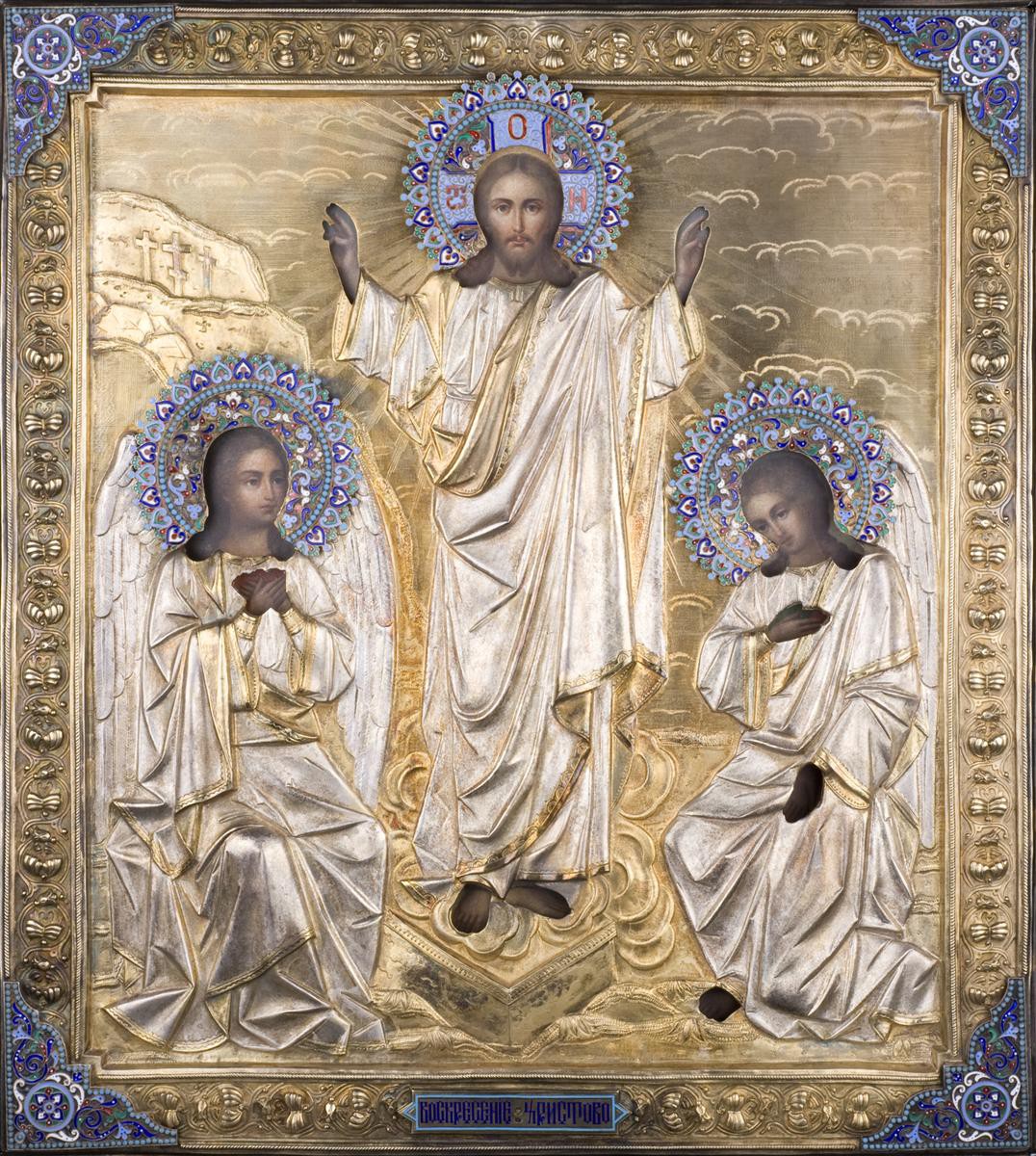 Россия, Москва, кон. XIX в. Серебро, чеканка, проработка, перегородчатая эмаль по скани, выемчатая эмаль, металл, масло. Клейма: пробы серебра "84", герб Москвы - "Георгий Победоносец". Размеры: 44,6х40см.