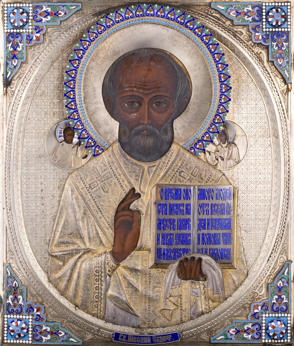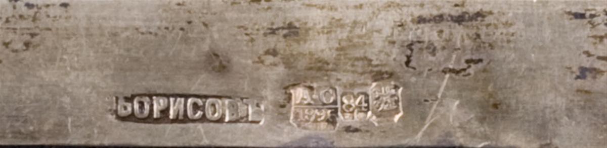 Россия, Москва, кон.XIXв. Серебро, чеканка, золочение, перегородчатая эмаль по скани, выемчатая эмаль, дерево, левкас,темпера,монтировка. Клейма: серебра "84"пробы, развернутое мастера- "Борисовъ", пробирного мастера "А.С" ( Смирнов Александр Сергеевич) н