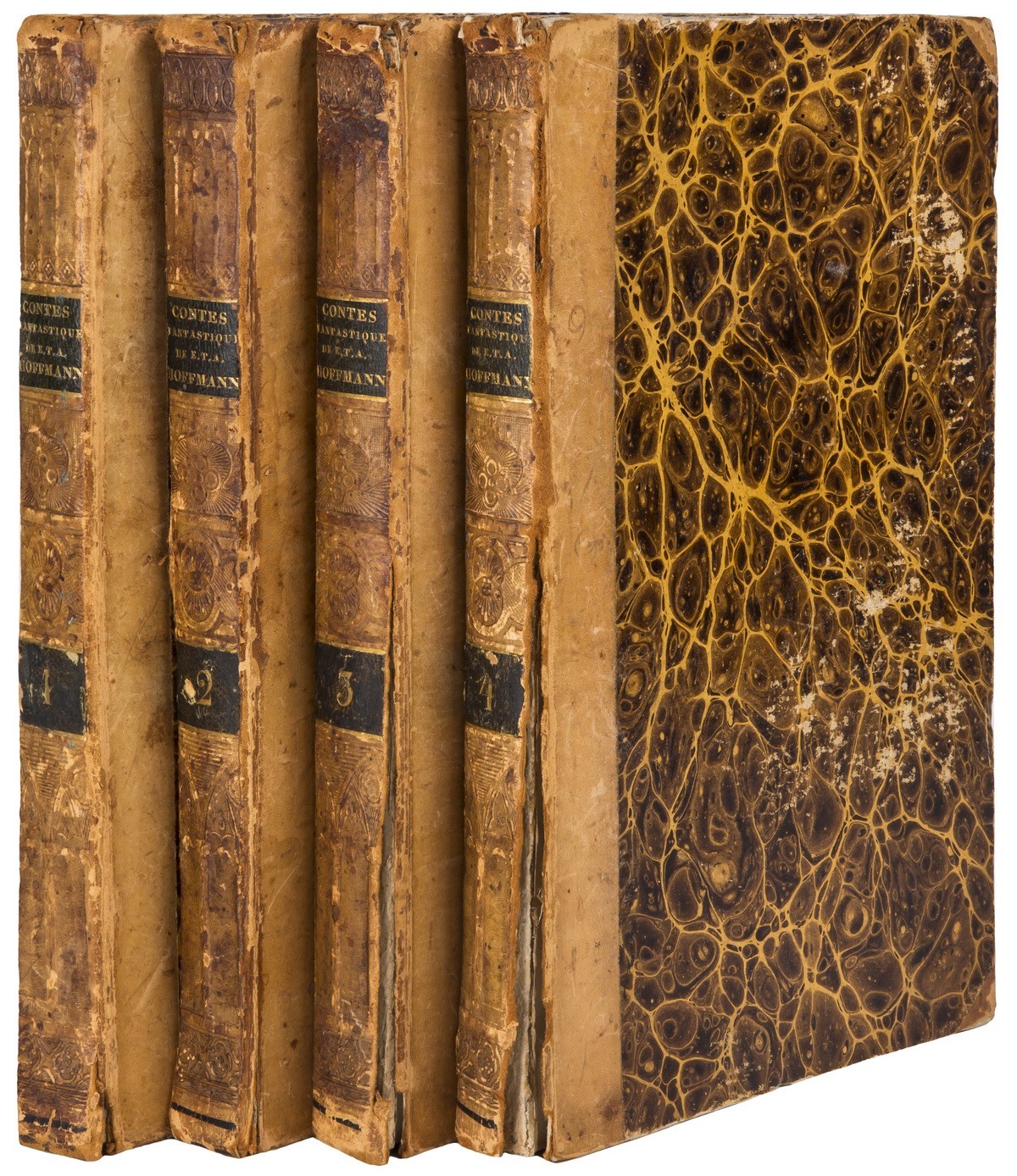 В четырех полукожаных переплетах эпохи с контрастными кожаными наклейками и художественным золотым тиснением на корешках. Тройные крапчатые обрезы. На фр. яз. Бум. сюжетный экслибрис В.И. Клочкова на нахз. тт.2-4 (снят в т.1).