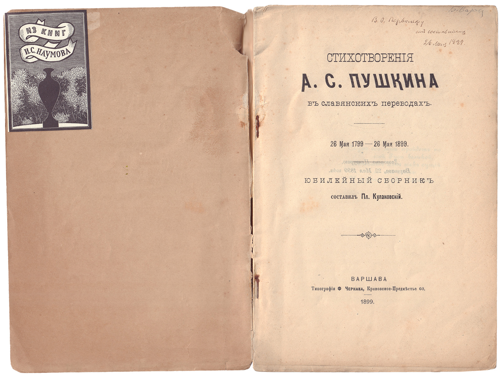 В издательской шрифтовой обложке. Дарственная надпись на тит. л.: «В.О. Первольфу / от составителя / 26 мая 1899». Сюжетный экслибрис «Из книг / И.С, Наумова» на с. 2 обл. (худ. Епифанов, Г. Д.; 1900-1985).