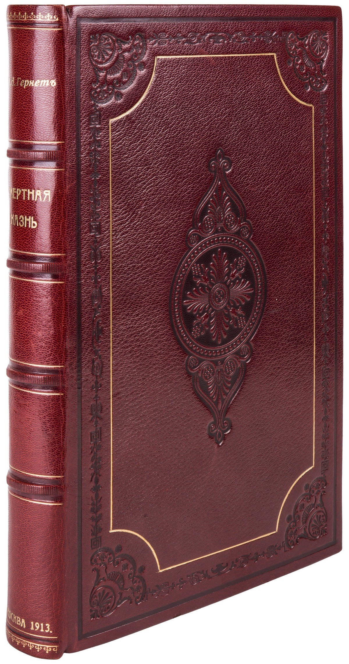 В цельнокожаном владельческом переплете с художественным блинтовым тиснением на пер. крышке и золотым по крышке и корешку с объемными бинтами. Форзацы оклеены декоративной бумагой. Золотая дублюра. Тройной крапчатый обрез. Издательская шрифтовая обложка сохранена в переплете.