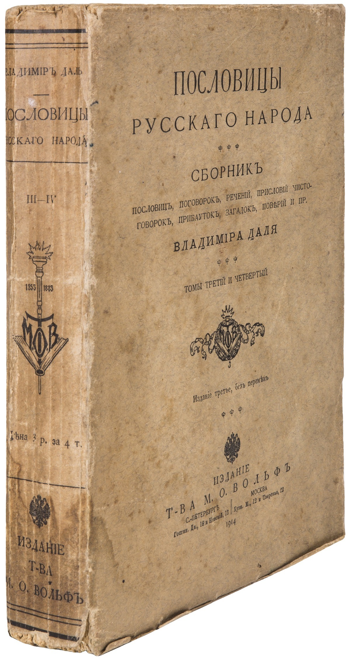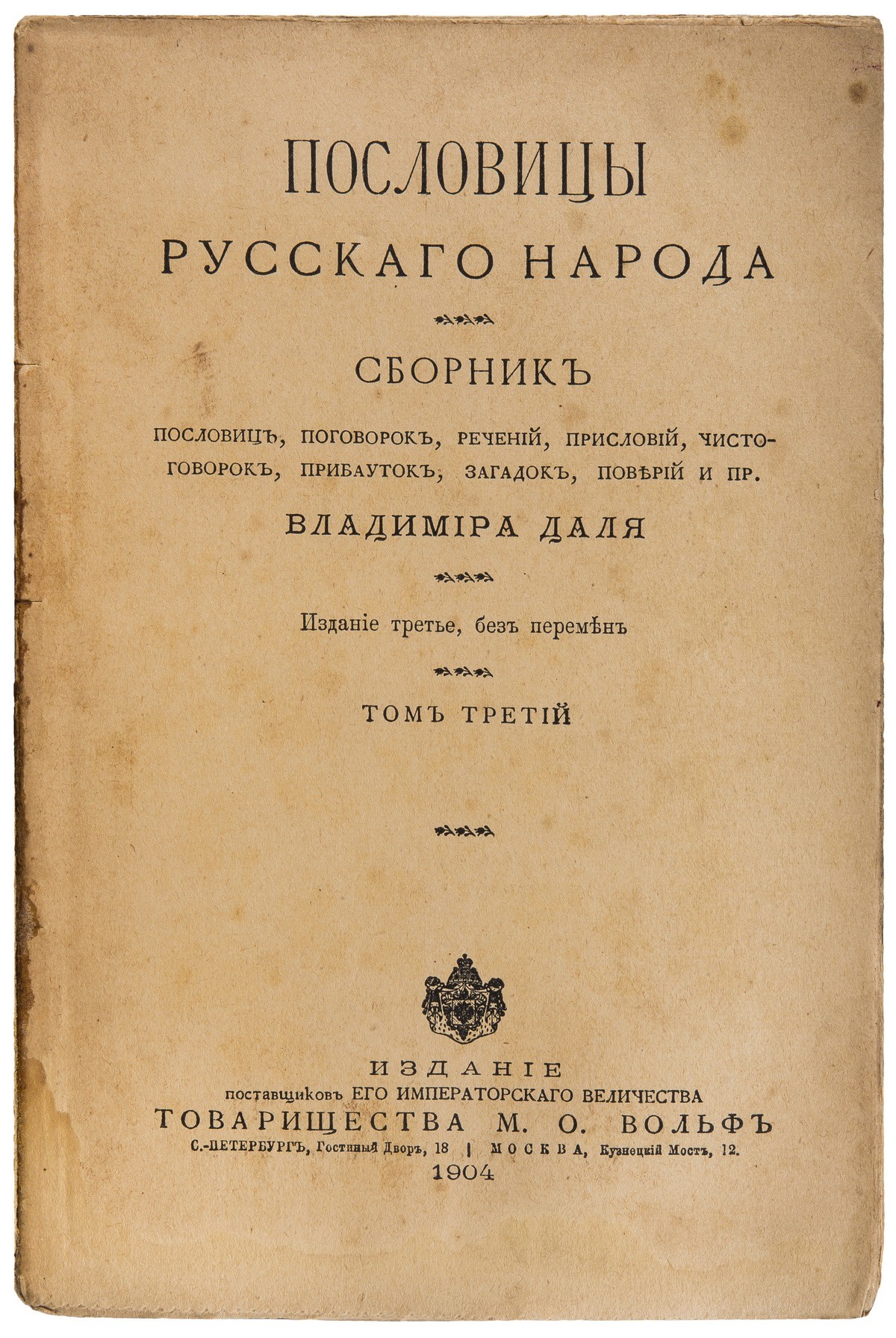 Сборник «Пословицы русского народа», включающий более 30 тысяч пословиц, поговорок и прибауток, структурированных по 179 тематических разделов, является одним из основных трудов великого русского этнографа и лексикографа Владимира Ивановича Даля (1801-1872). Работа над сборником велась Далем почти пятьдесят лет. Взятые вместе, пословицы раскрывают сложное, зачастую противоречивое в процессе своего развития мировоззрения народа; в пословицах совершенно ясно выражены оценка народом существующей действительности, его взгляды на жизнь. Как справедливо писал сам Даль в «Напутном» к первому изданию: «Разбор и оценка других изданий должны окончиться прямым или косвенным, скромным признанием, что наше всех лучше». Источниками для сборника послужили собрания Княжевича (около 5300 пословиц), Снегирева (около 4000 пословиц) и другие печатные издания, из которых в общей сложности Даль взял около 6000 пословиц, или около одной пятой части своего сборника. Основная часть была собрана Далем «по на слуху, в устной беседе», главнейшим источником стал «живой русский язык, а более речь народа».