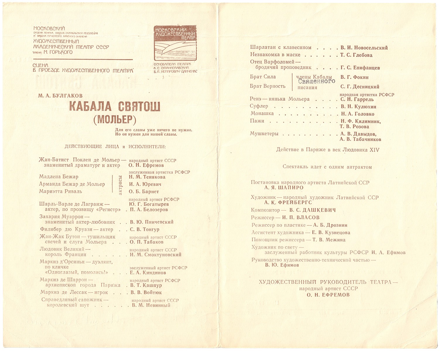 На программке автографы Олега Ефремова, других актеров театра МХАТ, а так же машинопись: Дорогой Владимир Терентьевич! / Поздравляем с премьерой. Желаем успеха. / 27/XII-88 г.