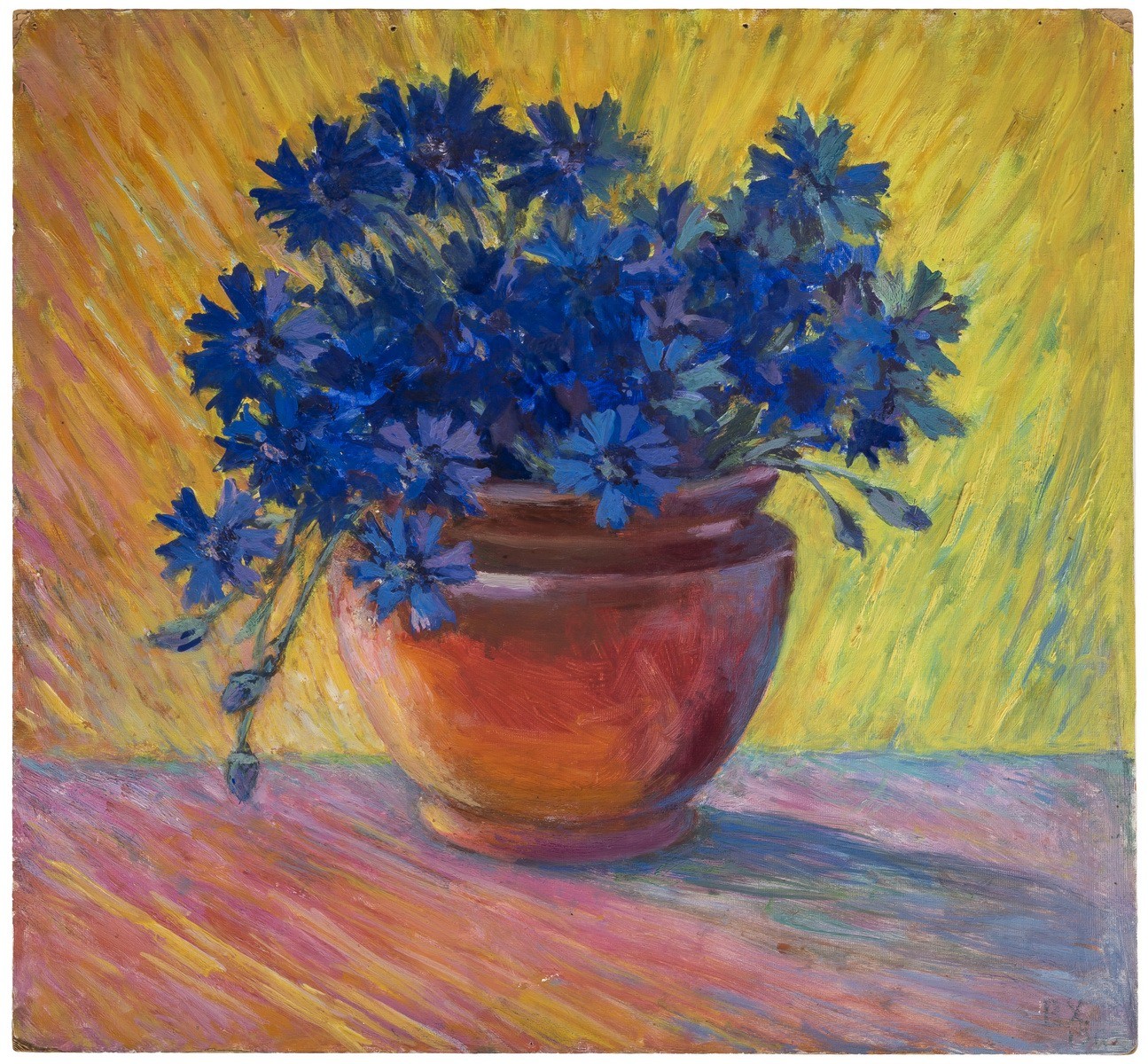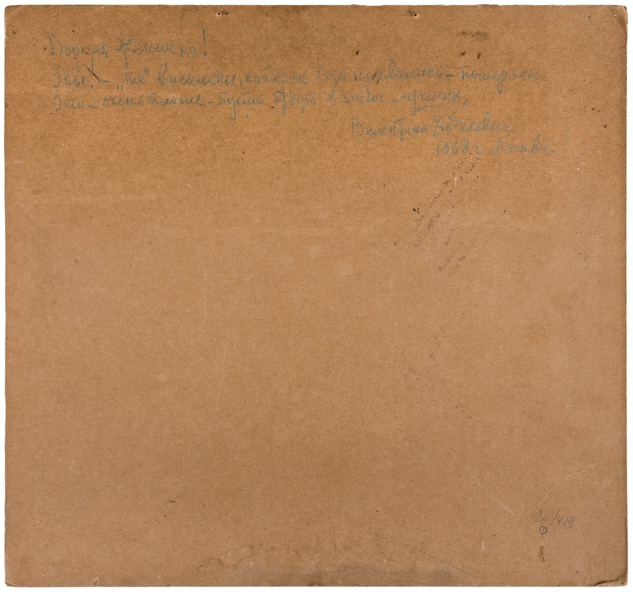 На обороте дарственная надпись художницы,ардесованная к Е.М. Вечесловой: "Дорогая Женечка! Увы! "Те" васильки, которые вам нравились - теперь утеряны. Эти - очень плохие - пусть будут взалог лучших. Валентина Ходасевич 1968 г. Москва".
