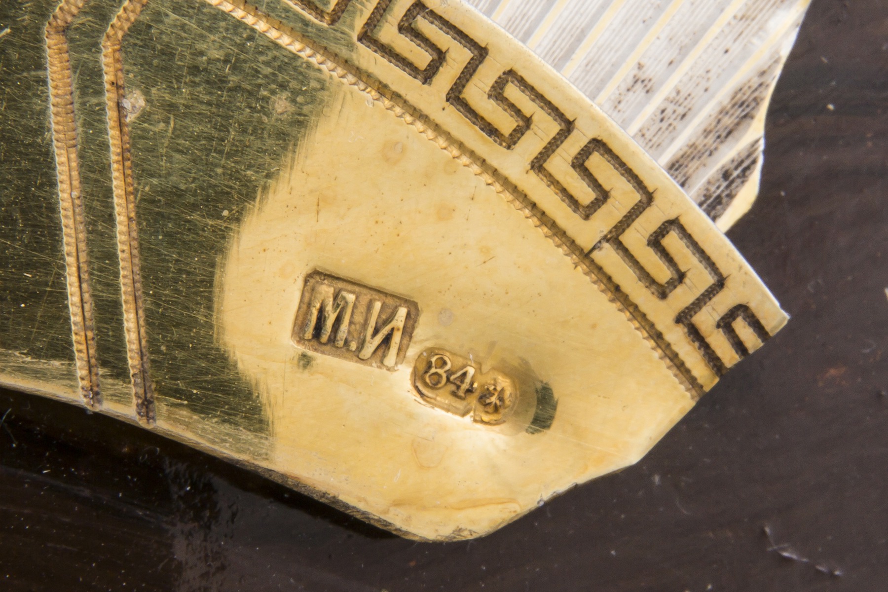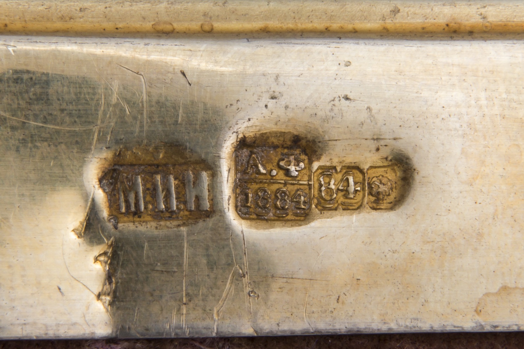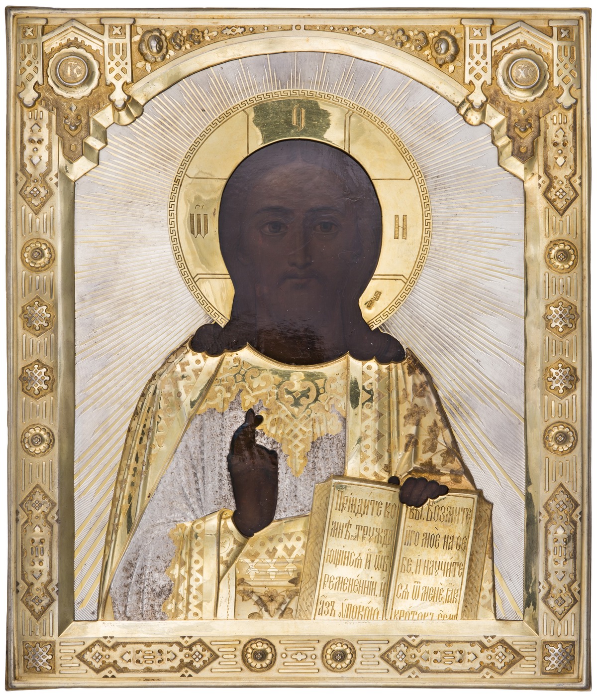 Дерево, цинк, масло; серебро, чеканка, штихель, золочение. Клейма: пробы «84» с гербом г. Санкт-Петербург «скрещенные якоря», инициалы пробирного мастера «А.Ф» над датой «1884», именник «М.И.И» и «М.И» владельца мастерской серебряных изделий Михаила Ивановича Иванова.