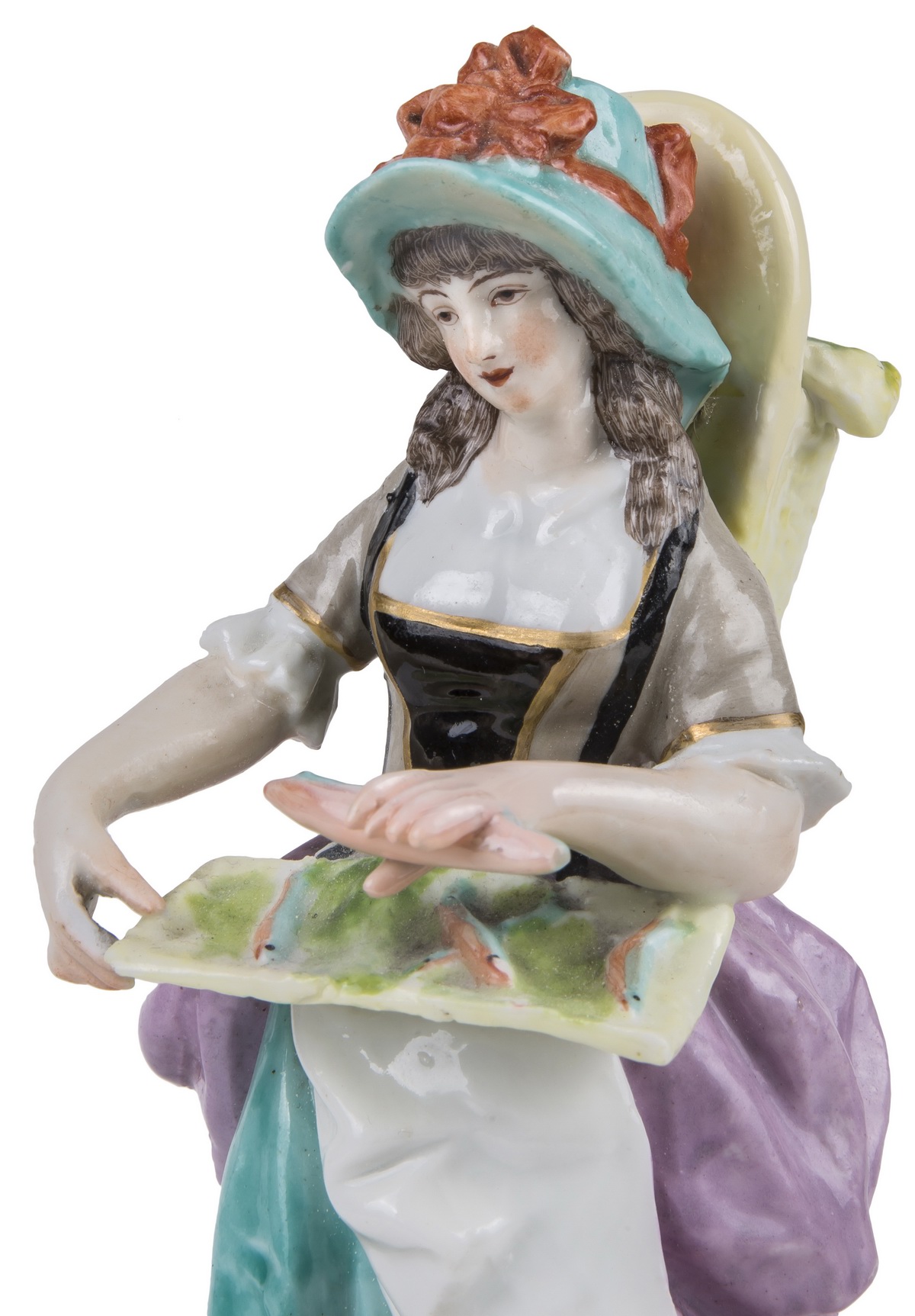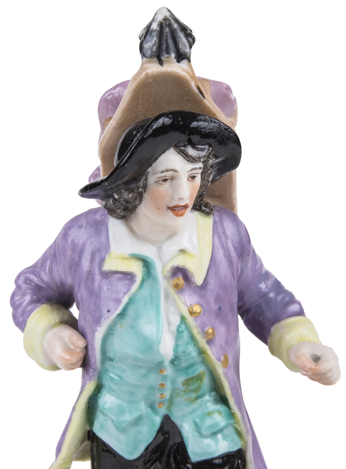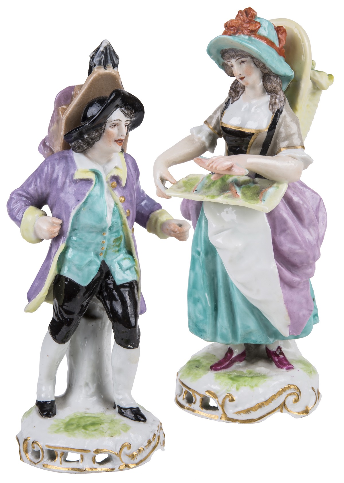 Фарфор, лепка, надглазурная полихромная роспись, золочение. На дне обеих фигур подглазурно марка синим: корона с литерами "СТ".