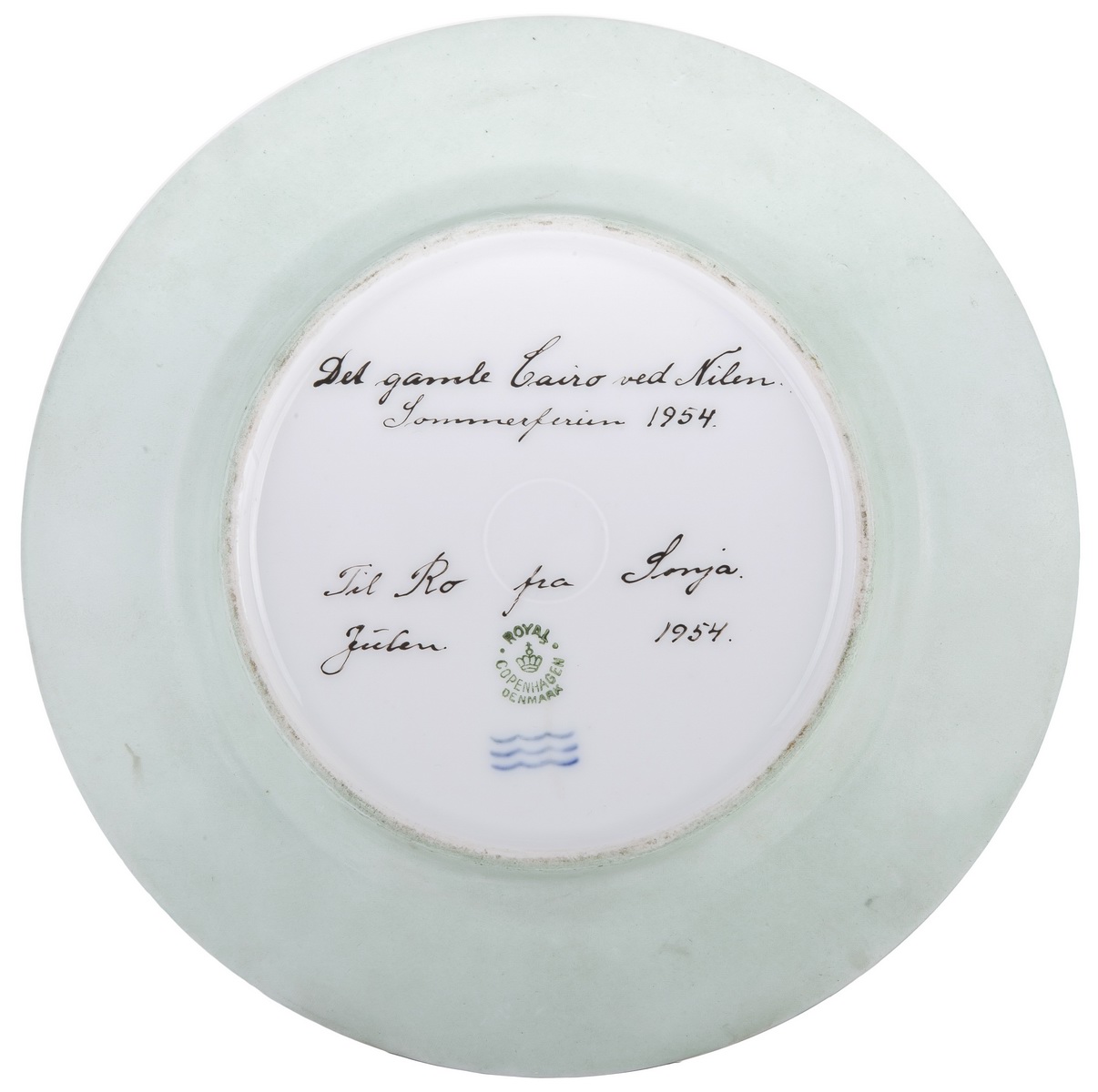 Фарфор, лепка, крытье светло-голубым, надглазурная полихромная роспись. На дне подлгазурно штампы: зеленая корона с надписью "ROYAL COPENHAGEN DENMARK" под синими волнами (1939); надгалузрно от руки черным дарственная надпись на датском языке.