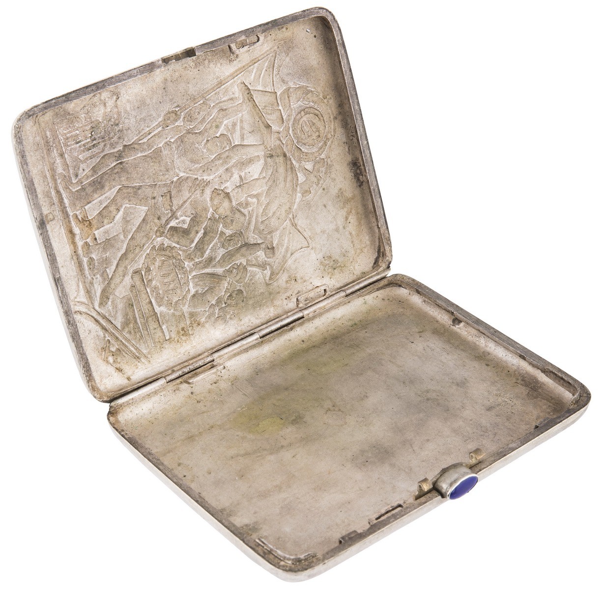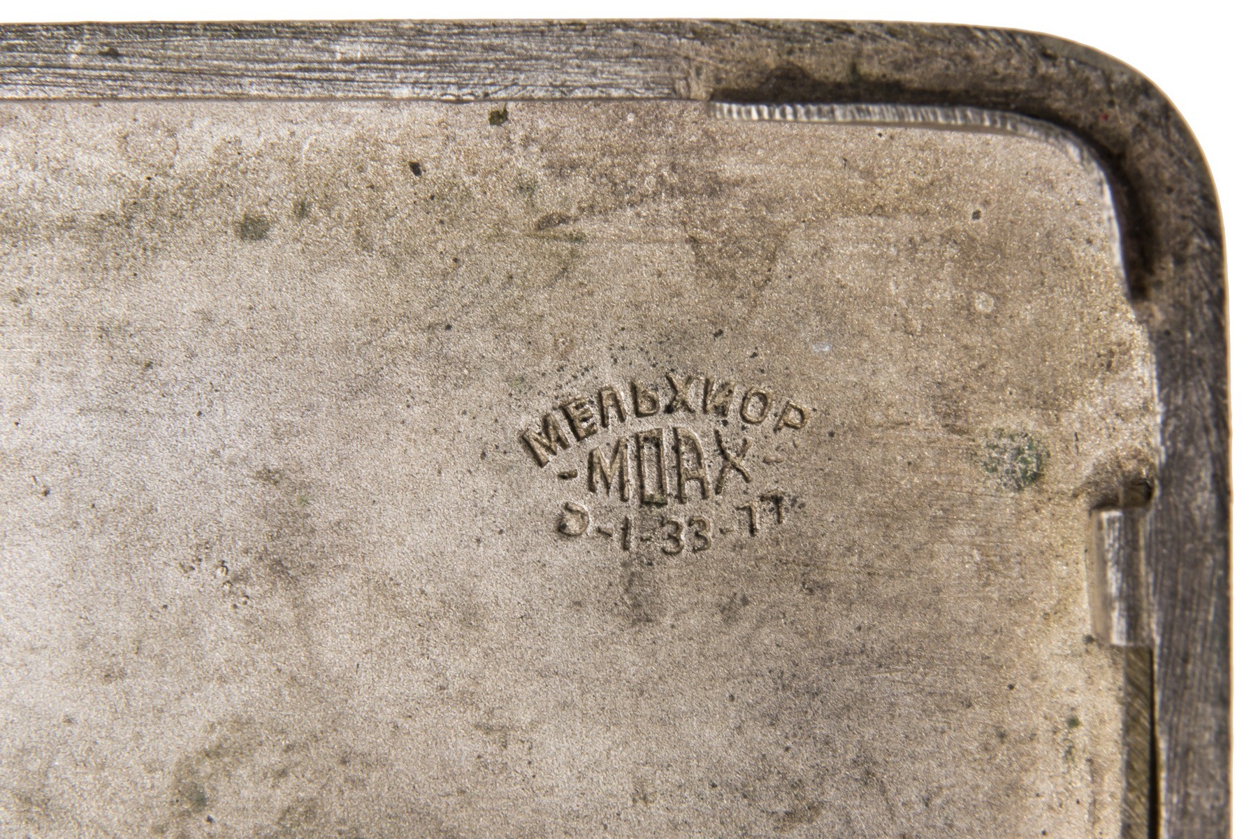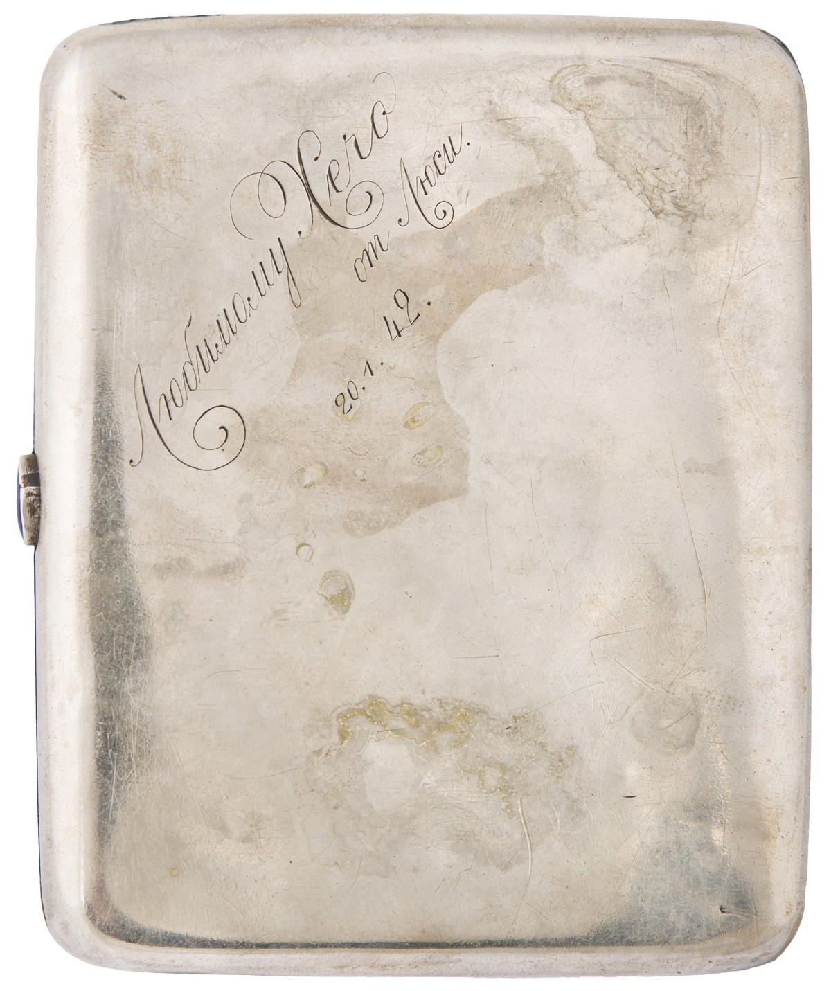 Мельхиор, вставка синего цвета огранки «кабошон». Чеканка. Клейма: «Мельхиор МОАХ D-1-33-77» буква «К». Дарственная гравировка: «Любимому Xеro / от Люси / 20.1.42».
