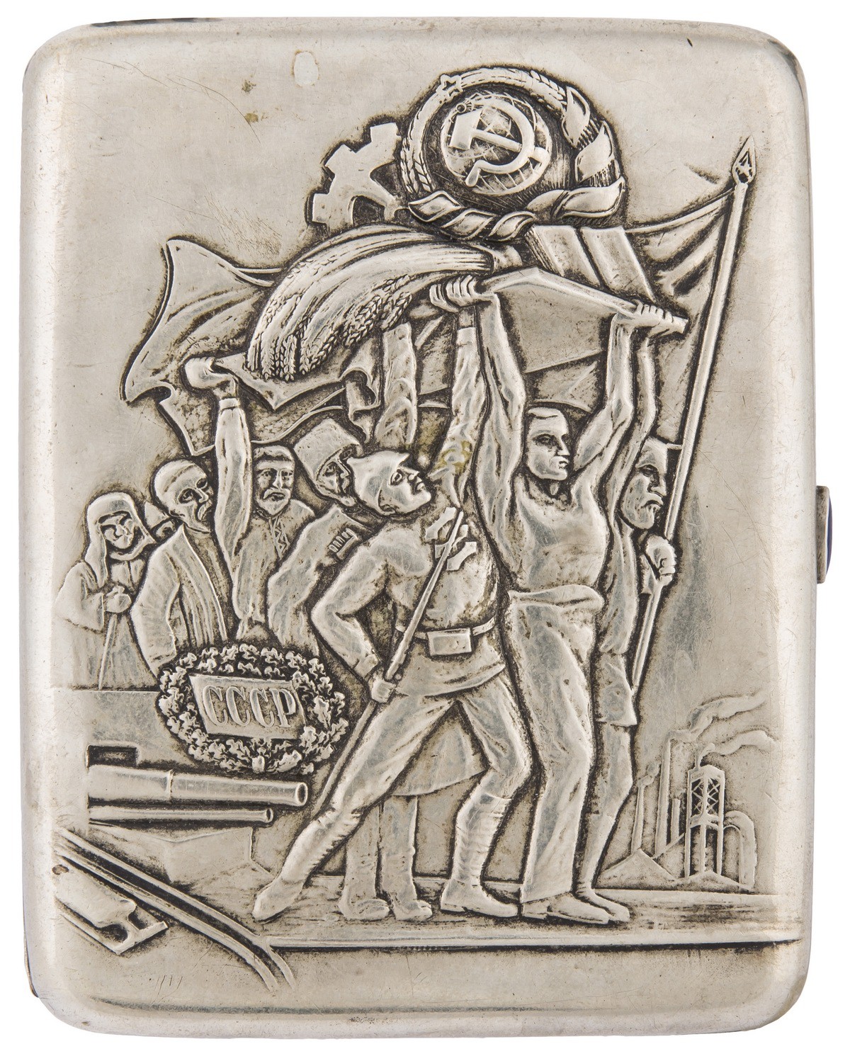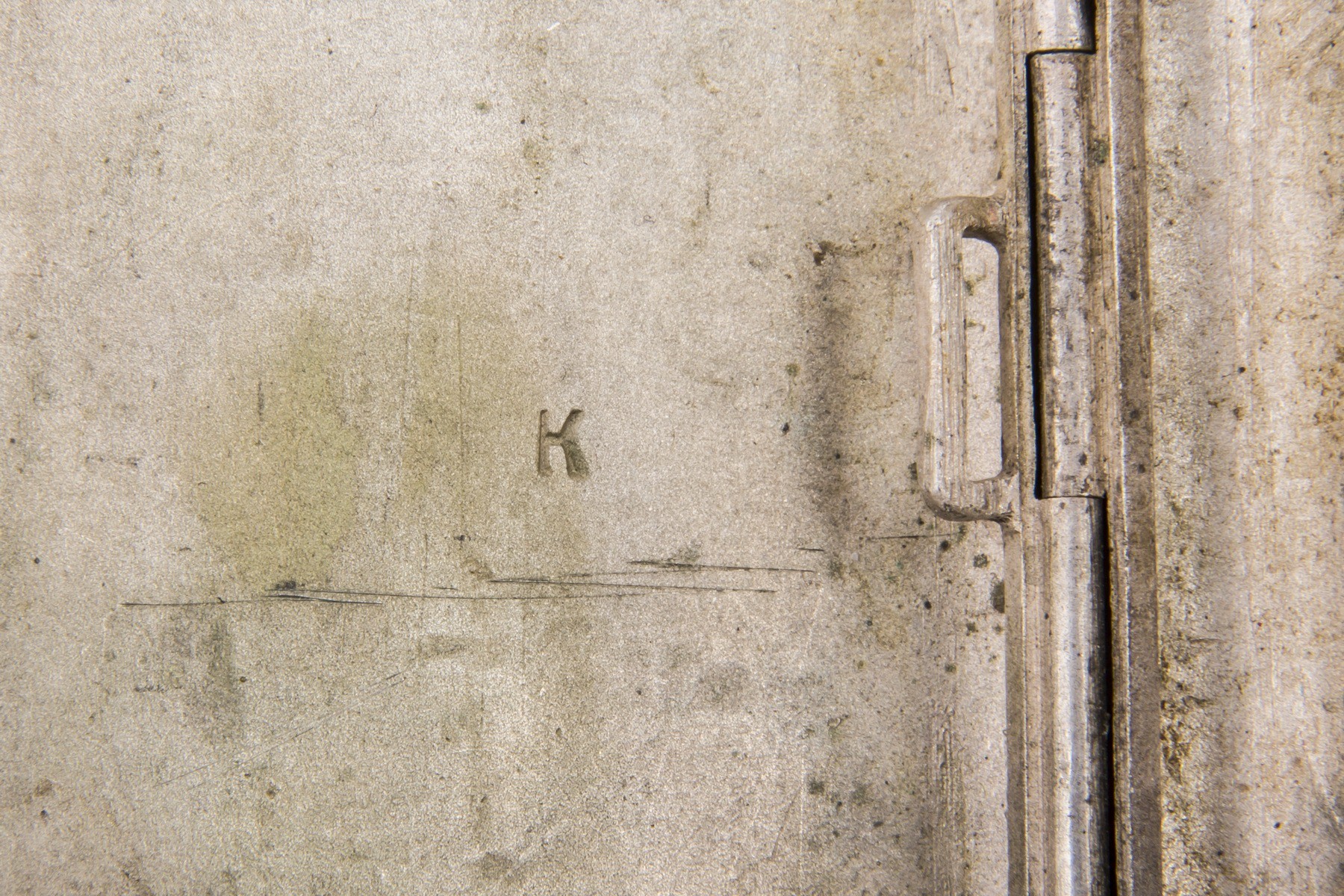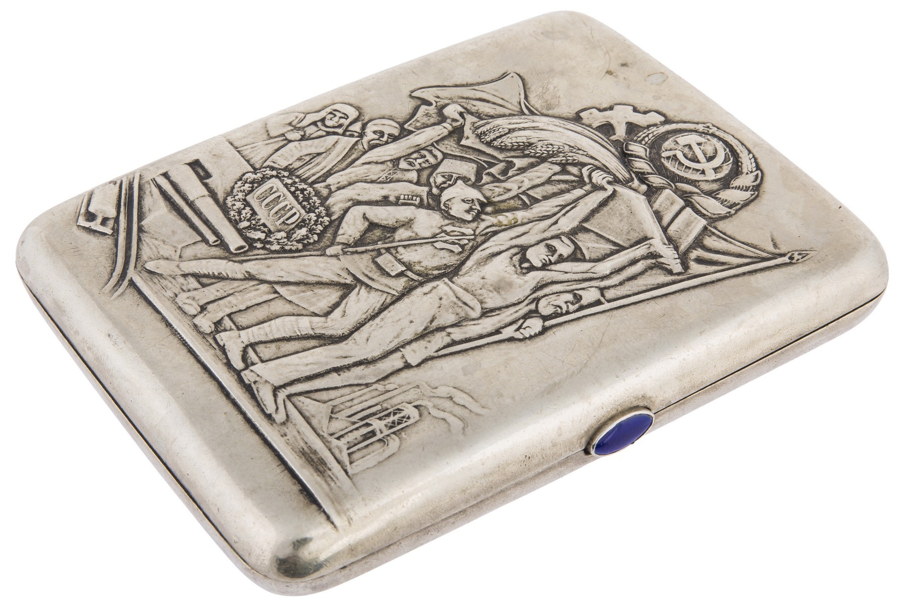 Мельхиор, вставка синего цвета огранки «кабошон». Чеканка. Клейма: «Мельхиор МОАХ D-1-33-77» буква «К». Дарственная гравировка: «Любимому Xеro / от Люси / 20.1.42».