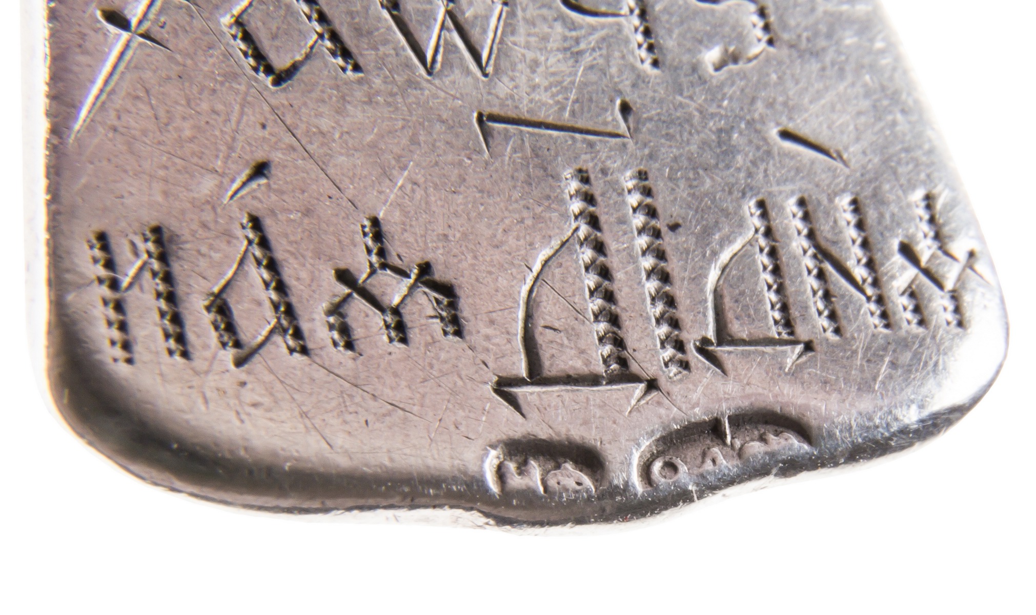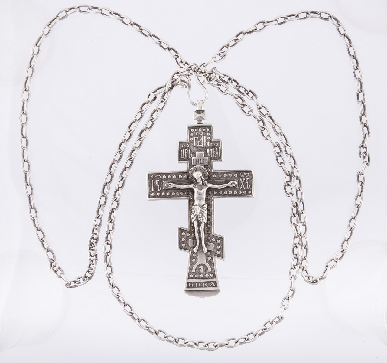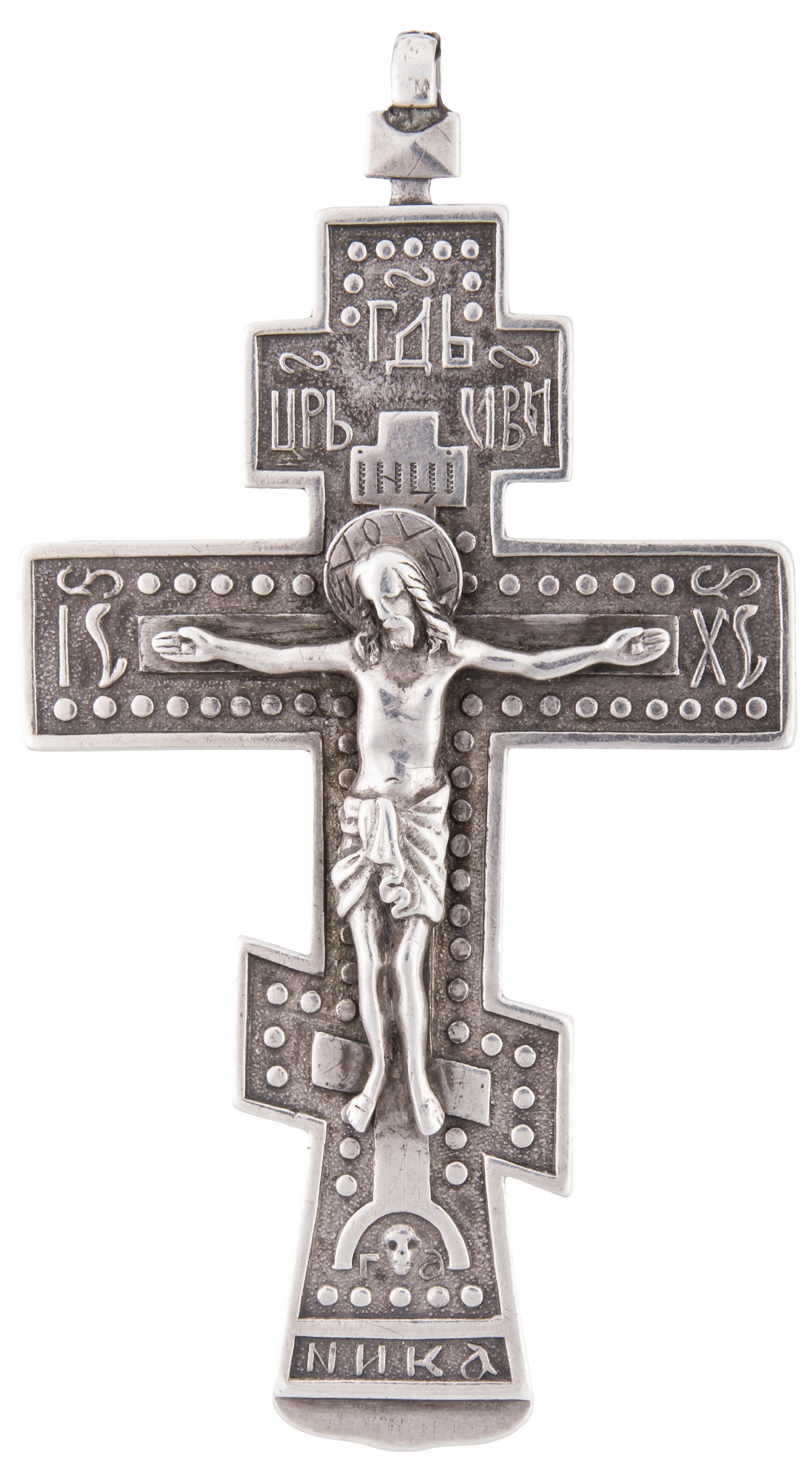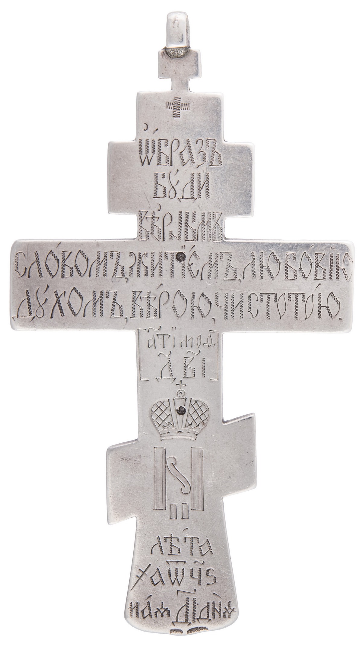 Серебро, литье, чеканка, гравировка. Клейма: «84», «Георгий Победоносец на конец» (?); «НФ» (?) - неизвестный мастер.
