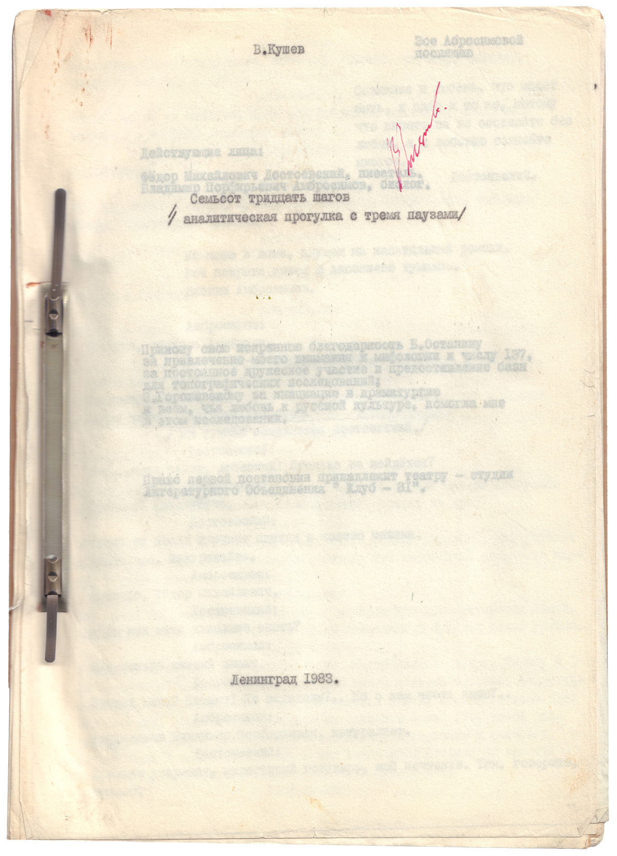 Автограф автора на тит. л. Листы подшиты в папку издательства Элинина. Самиздат рассказа-пьесы писателя Владислава Кушева. Действующие лица - Федор Михайлович Достоевский, Владимир Порфирьевич Амбросимов. Место действия — город Петербург / Ленинград, время действия — 15 декабря 1982 года. ”730 шагов" впервые опубликованы в 1986 г. в журнале "Часы".