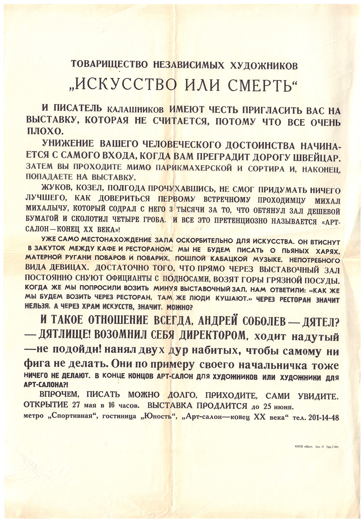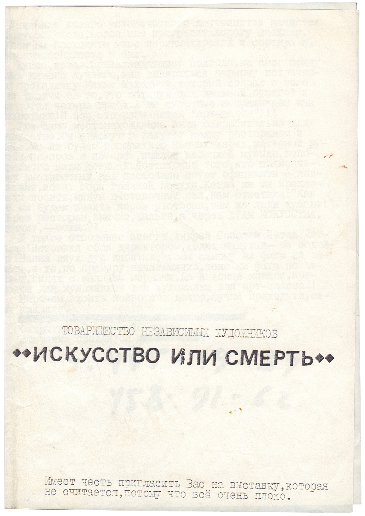 Товарищество независимых художников "Искусство или смерть!" возникло в Ростове в 1988 году, объединив прогрессивно настроенных ростовских художников. Первая официальная выставка художников, вошедших в товарищество, а также к ним примкнувших состоялась весной 1987 г. в Таганроге .