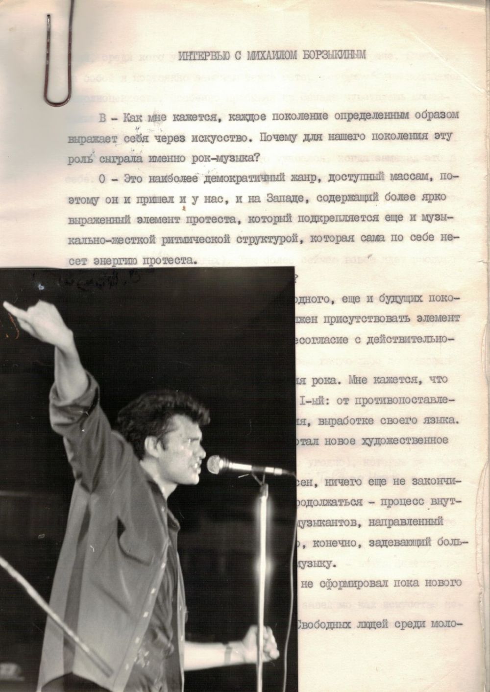 Интервью журналистки и писательницы Алисы Бяльской (1969) с рок-музыкантом, основателем и бессменным участником группы «Телевизор». Михаилом Владимировичем Борзыкиным (1962).