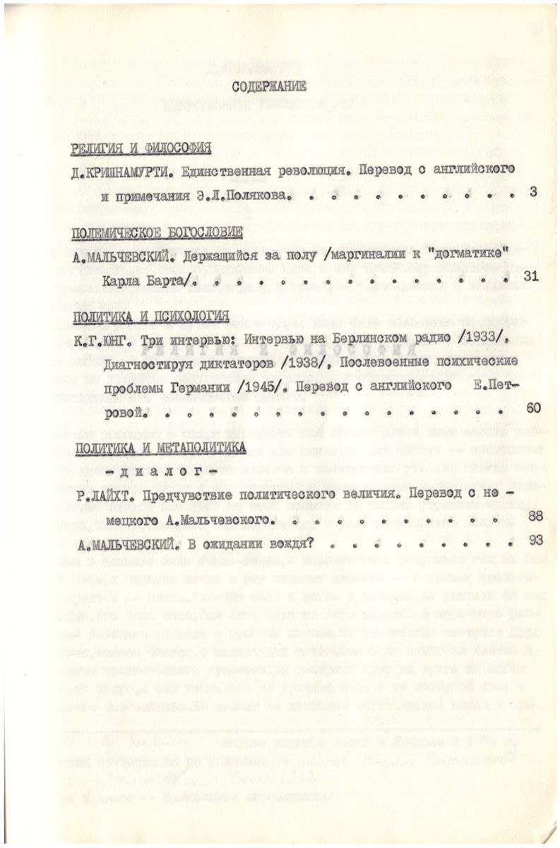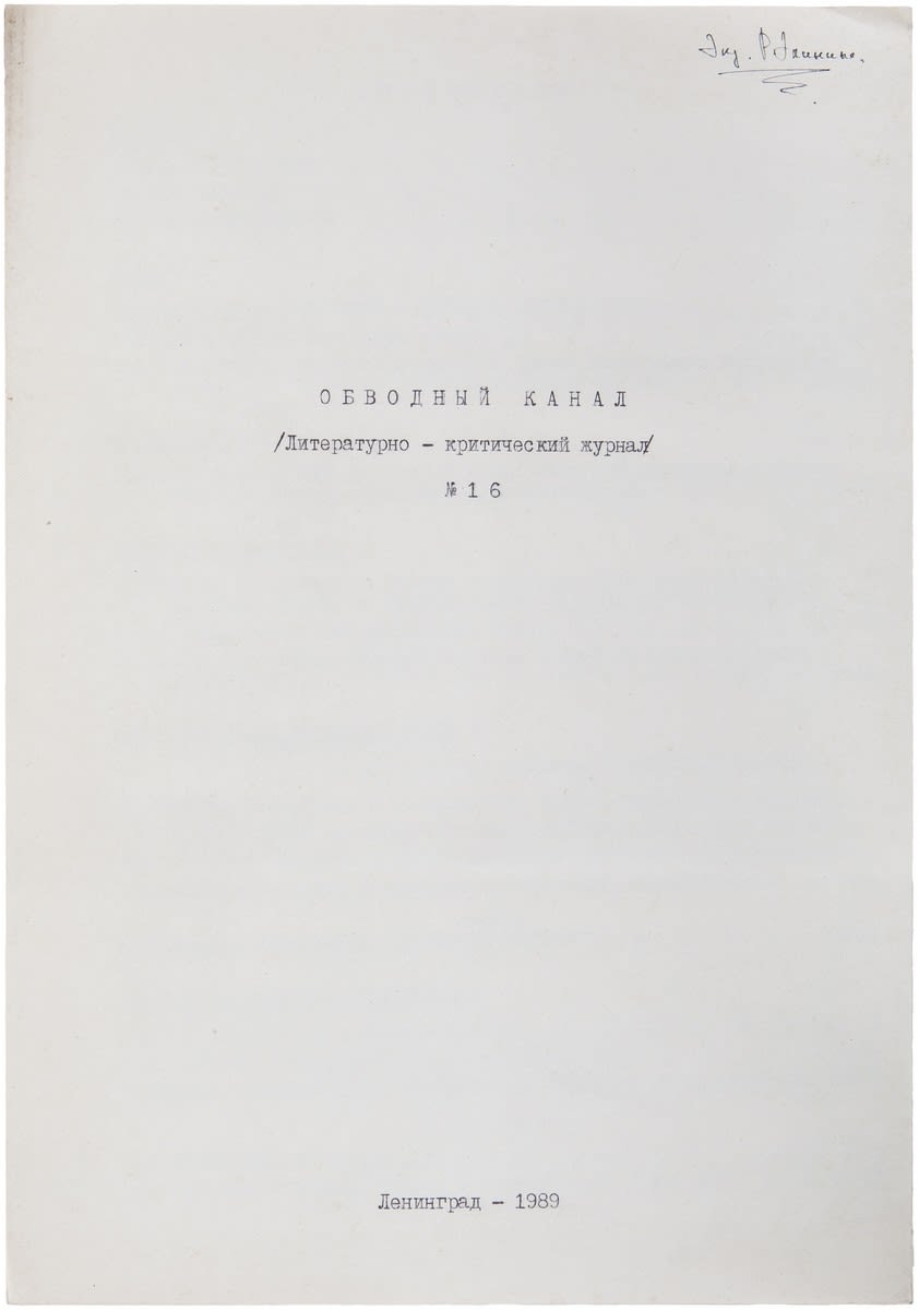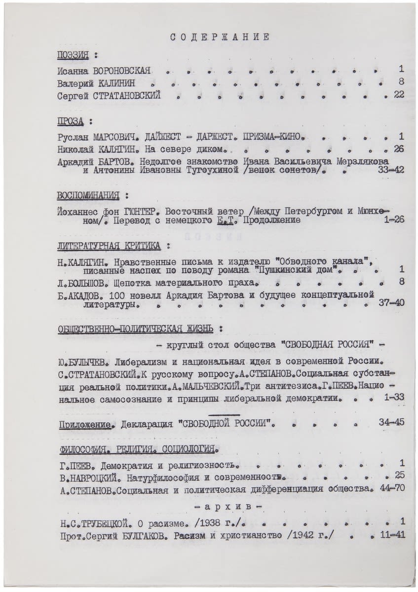 Машинописный экземпляр журнала, подаренного Руслану Элинину издателем Сергеем Стратановским. Несброшюрованные л. помещены в папку. В номере опубликованы произведения Сергея Стратановского, Аркадия Бартова, Николая Калягина и других представителей неофициальной культуры.