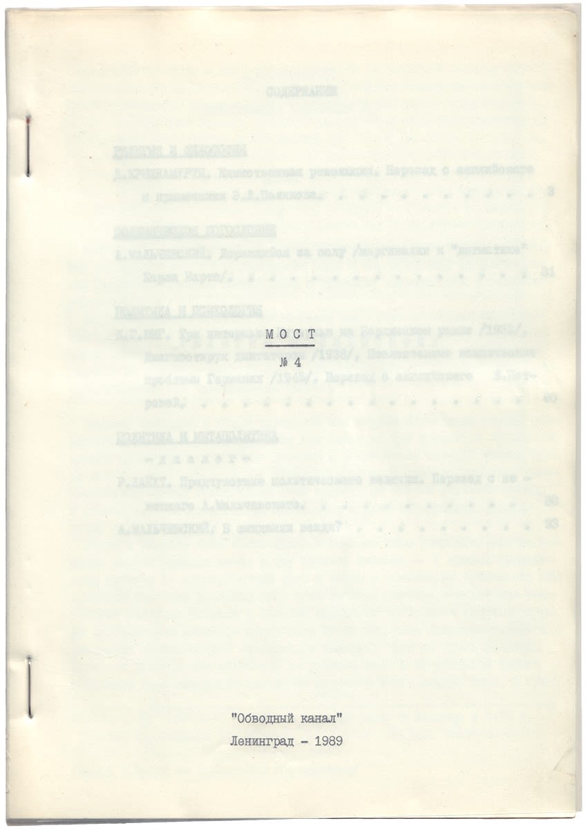«Мост»: [переводческое приложение к журналу «Обводный канал»]. - Л.: [Самиздат], 1989. - №4. - [1], 97, [1] л.; 30x21 см. В самиздатской обложке из пластика. Машинопись. В номере — три интервью К.Г. Юнга, "В ожидании вождя ?" А. Мальчевского и др.