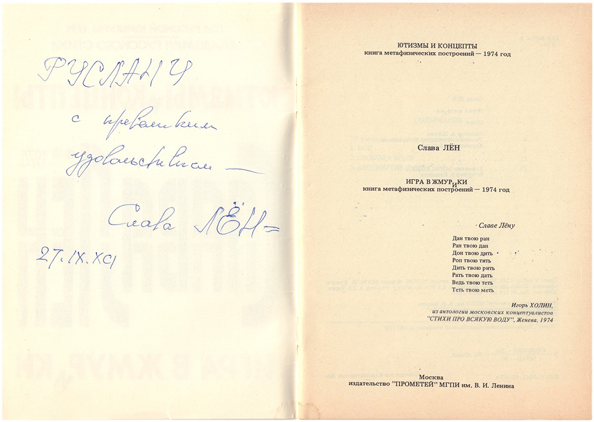 На форзаце дарственная надпись автора, адресованная Руслану Элинину: «Руслану / с превеликим / удовольствием — Слава Лен / 27.IX.XCI».