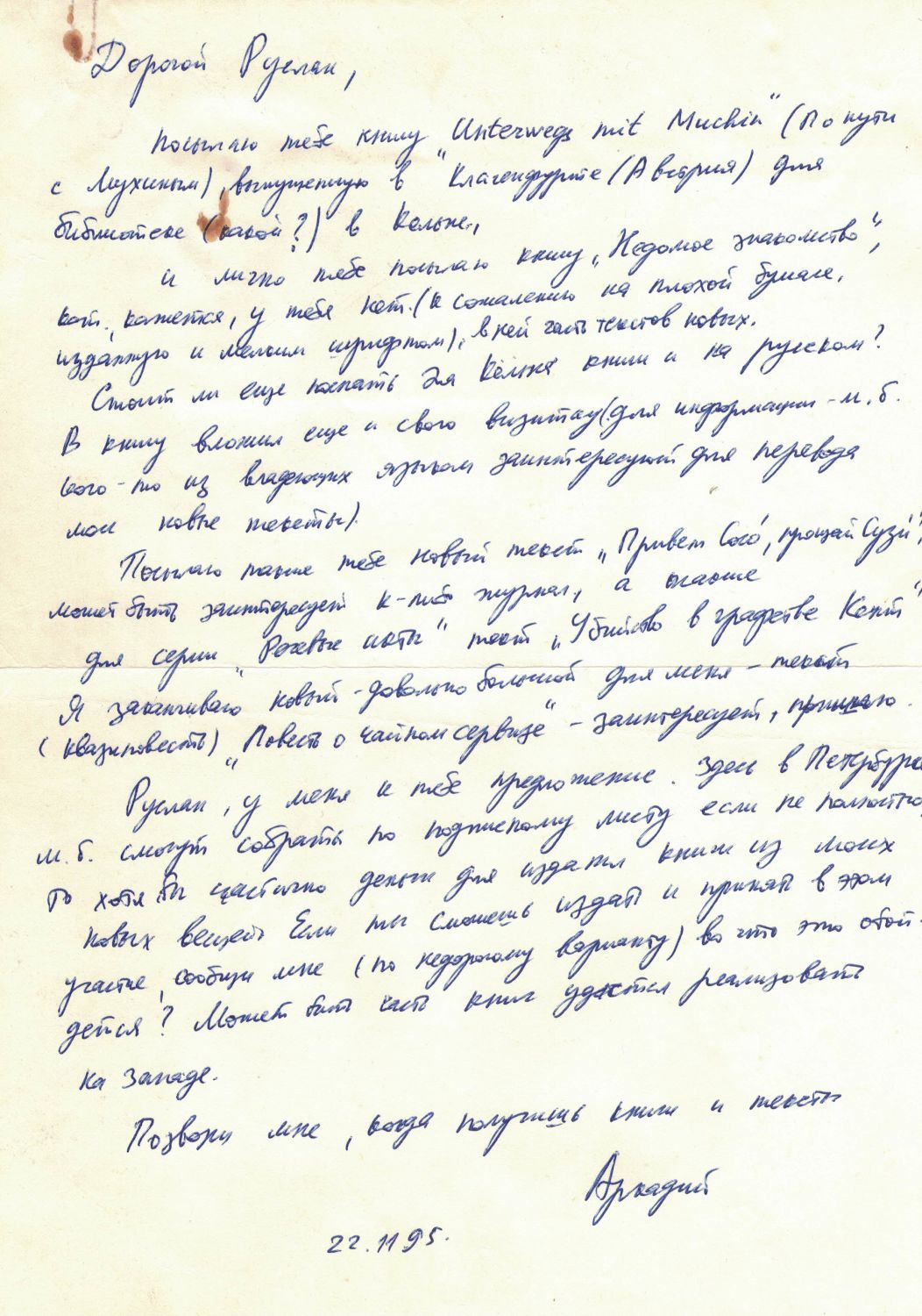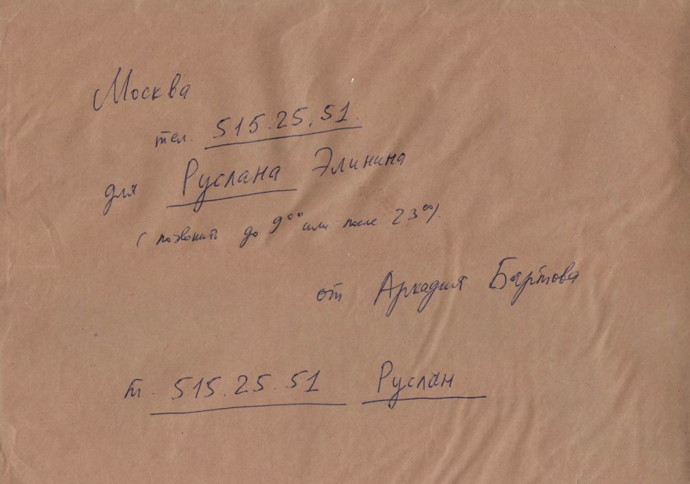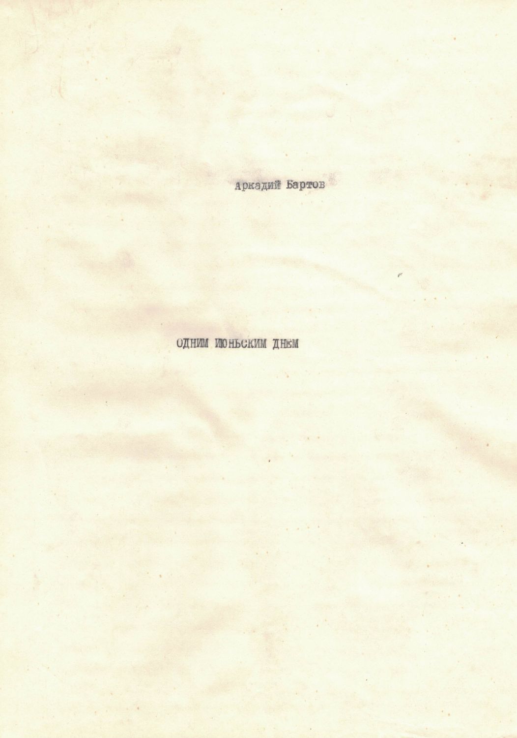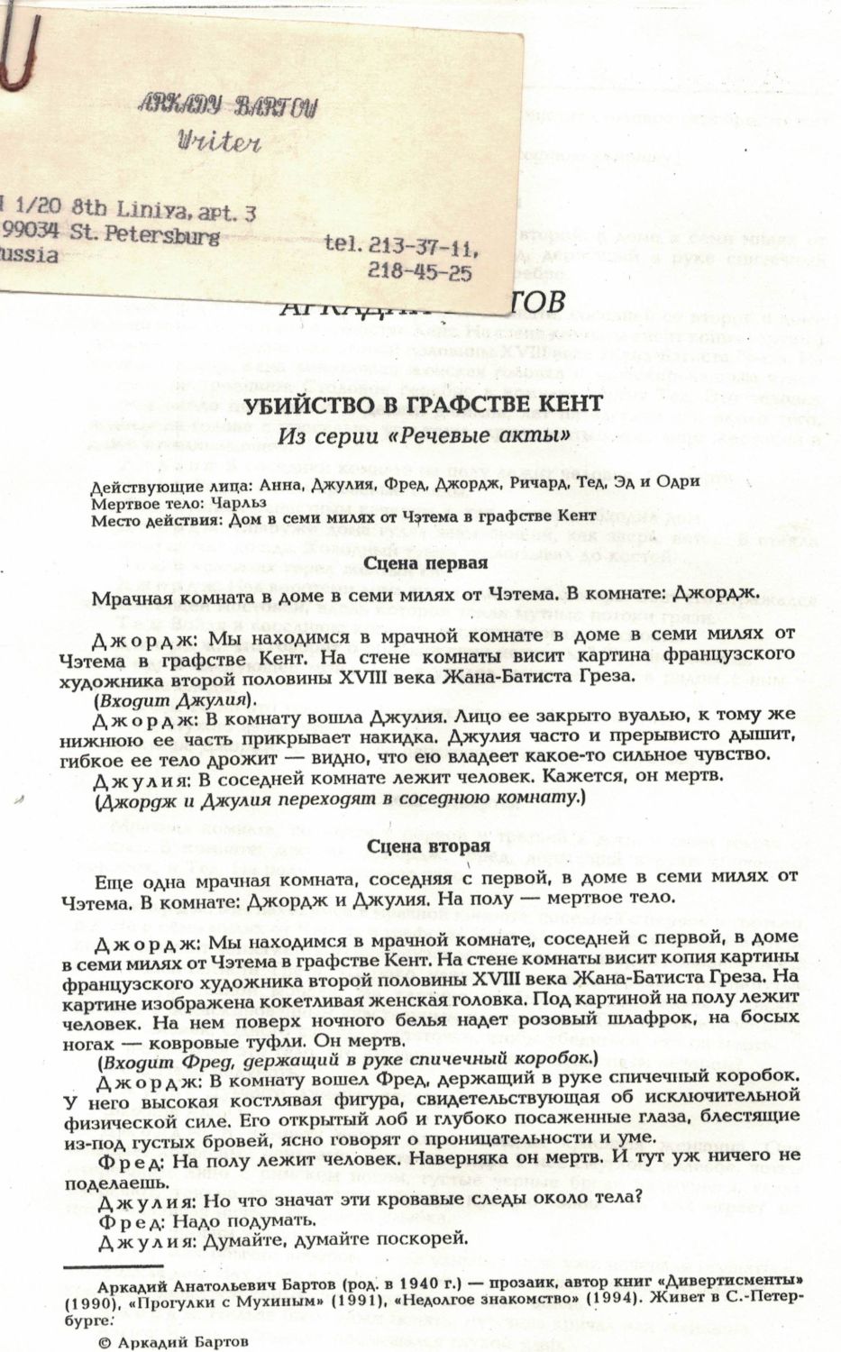 1. Письмо к Руслану Элинину. 22.11. 1995. Рукопись. - 1 л.; 30x21 см. 2. Бартов, А.А. Одним июньским днем. 1990-е. Машинопись. - 1 л.; 29x21 см. 3. Бартов, А.А. Отдых после завтрака Анны и Джулии, последующих их встречи с Фредом и Джорджем в присутствии Чарлза. Из серии "Речевые акты". 1990-е. Машинопись. - 4 л.; 29x21 см. 4. Бартов, А.А. Обмен впечатлениями Анны и Джулии о груди и ногах Чарлза с появлением время от времени Фреда и Джорджа. Из серии "Речевые акты". 1990-е. Машинопись. - 4 л.; 29x21 см. 5. Бартов, А.А. Беседа одетой в розовые панталоны Анны и в голубые — Джулии с отвечающими им Фредом и Джорджем при молчащем Чарлзе. Из серии "Речевые акты". 1980-е. Машинопись. - 4 л.; 29x21 см. 6. Бартов, А.А. Убийство в графстве Кент. Из серии "Речевые акты". 1990-е. Компьютерный набор. - 6 л.; 26x17 см. 7. Бартов, А.А. Привет Сосо, прощай Сузи! Или Смерть кузнечика. 1990-е. Компьютерный набор. - 5 л.; 30x21 см.