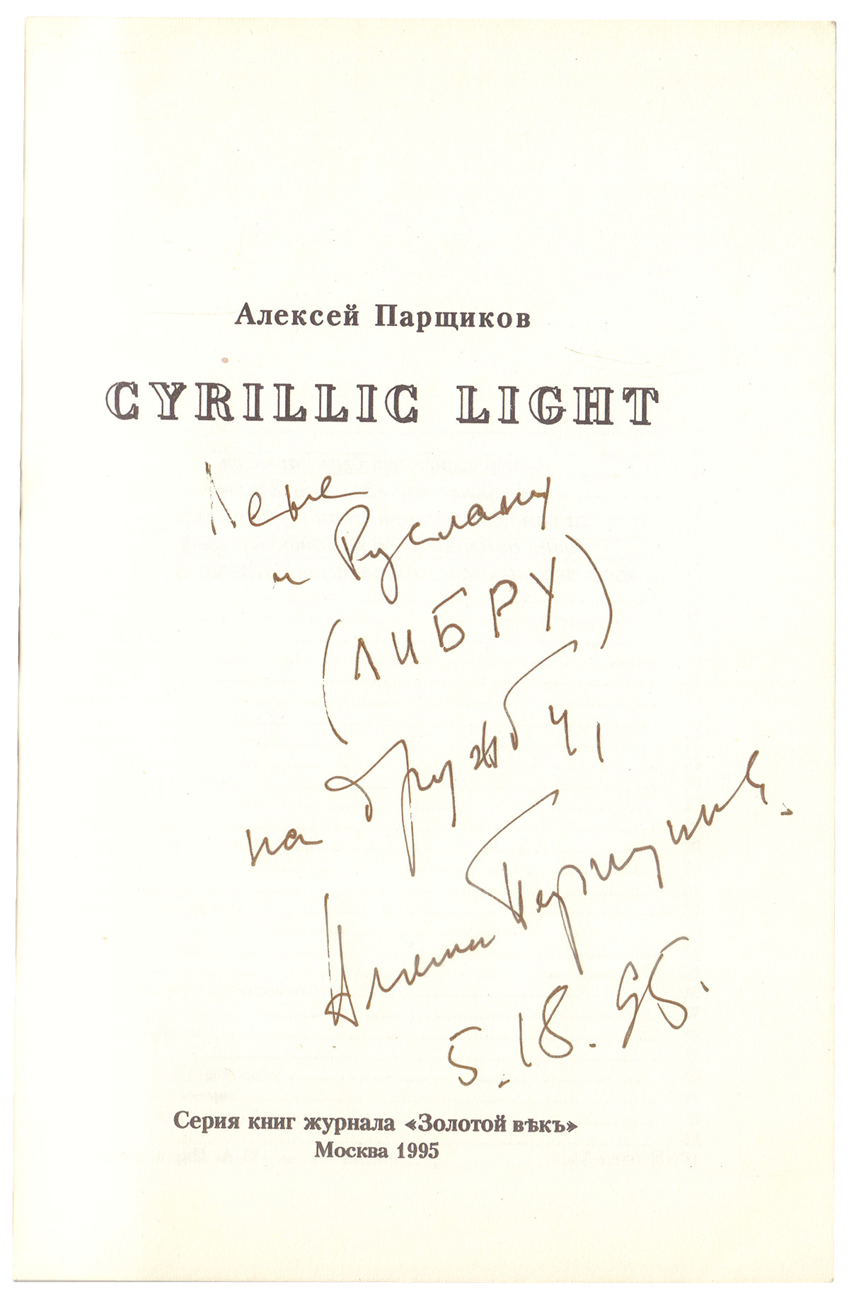 Парщиков, А.М. [автограф]. Cyrillic light: [Стихи] / Алексей Парщиков. М.: Товарищество «Золотой векъ», 1995. — 110, [1] с.; 21,х14,6 см. — (Серия книг журнала «Золотой векъ»).