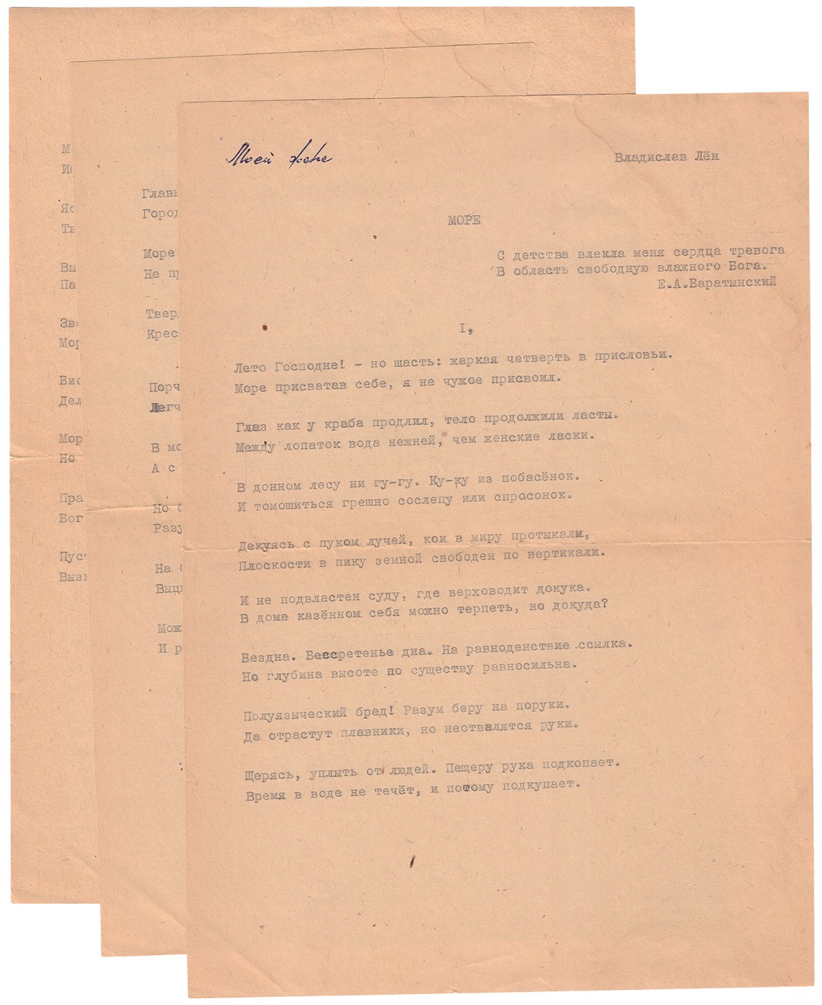 Фрагмент стихотворения опубликован в воспоминаниях Лена: «Олег Охапкин, инициативный и коммуникабельный, зачастую первым прорубал просеки – дороги к «нужным» людям. Так, под зонтиком (безопасности – у неё дипломатический паспорт) Сюзанны Масси – с интригой печатать Антологию русского стиха в США – он притащил меня в 1969-ом к Евгению Евтушенко в высотку Котельников. – Зачем? – я спрашивал Охапкина. – Вдруг напечатает в «Юности»! – Он уже напечатал Губанова – иронизирую я – 4 строчки... Тем не менее, мы читали Евтуху стихи – я с подначкой: под цензурой – такие не напечатаешь! – МОРЕ: Море не выпить тебя, вобрав гуттаперчевым лоном. / Ибо наперчено слишком и чудишься очень солёным.… / В море спуститься рекой – сподобиться суть удаче. / А с судаком молчать – не с мудаком судачить. <...> Евтух делает вид, что слово «мудак» его не смущает, и говорит, как эстет: Время в воде не течёт – гениально. Сюзанна Масси тоже подначивает его: Шикарная у вас квартира, Егений Александрович! – Продаваться, так дороже! – нагло отвечает Евтух».