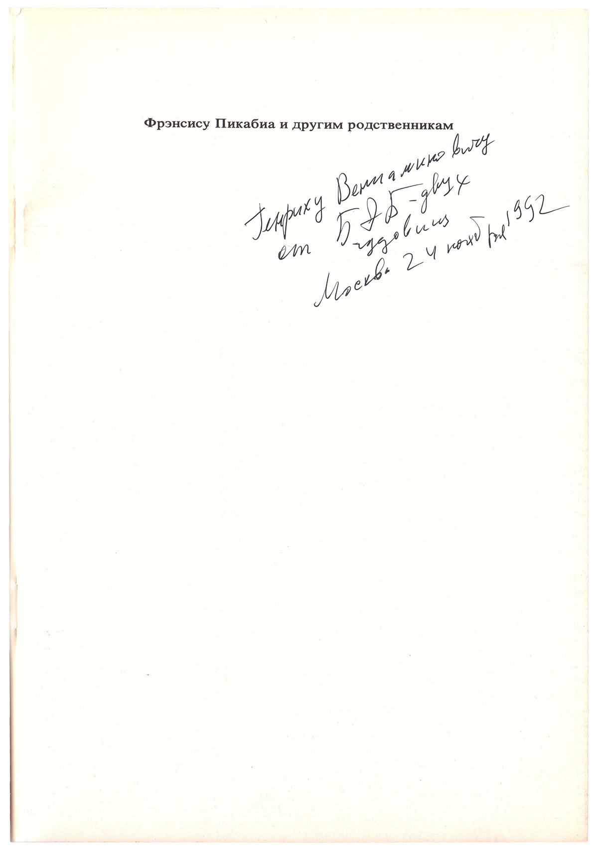 Дарственная надпись на странице посвящения: «Генриху Вениаминовичу / от Б&Б - двух / чудовищ / Москва 24 ноября 1992».